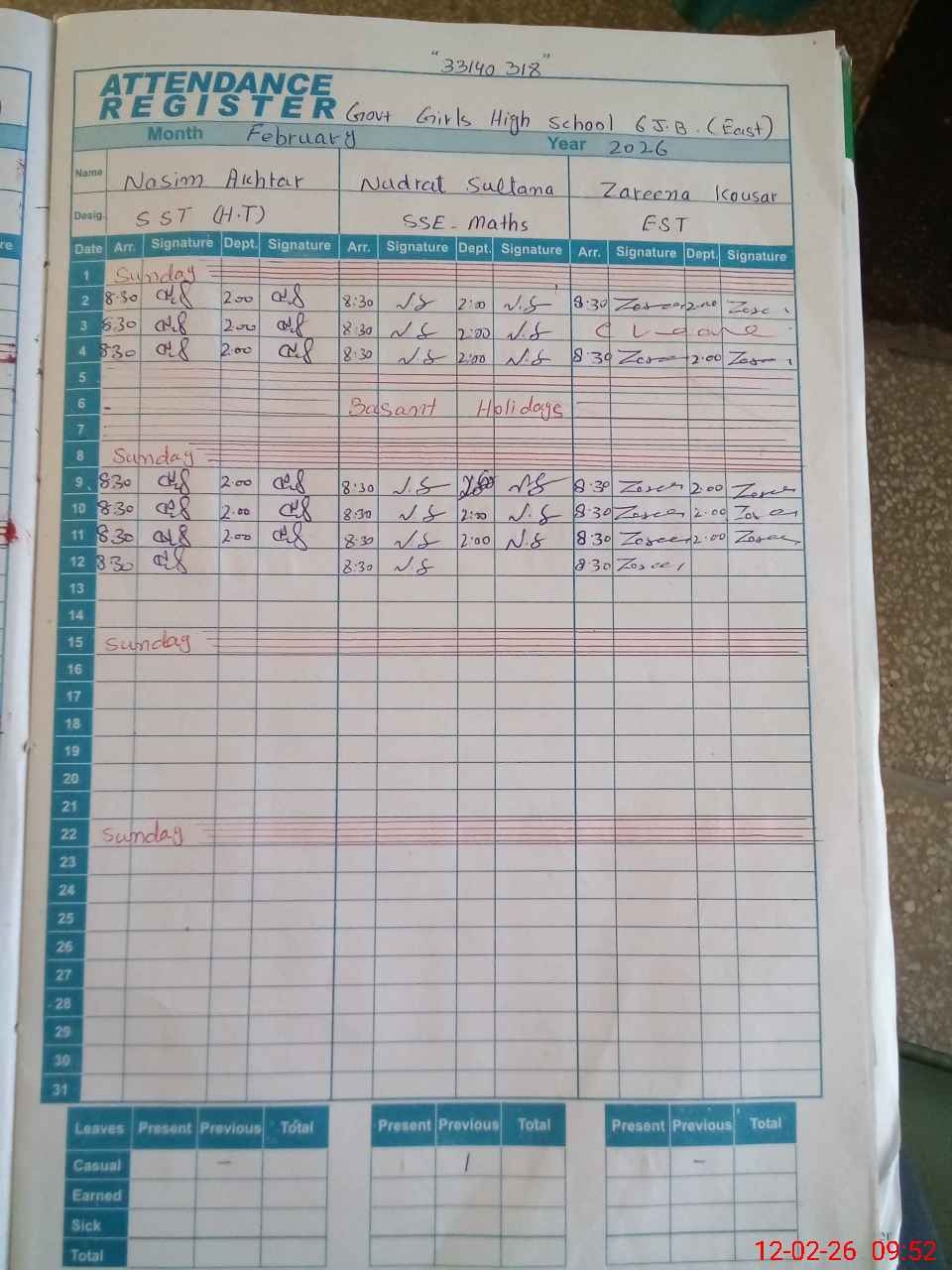 | No. of Students Present - Female | 0 | 0 | 77 | 68 | 52 | 56 | 55 | 61 | 69 | 48 | 50 | 42 | 641 | |||