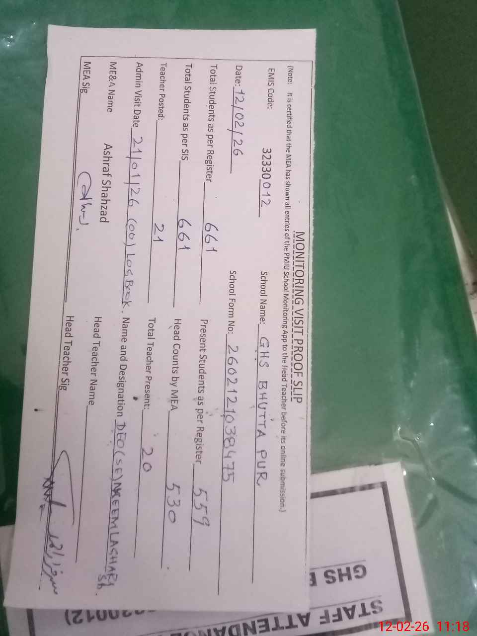 | Attendance Register | Head Teacher | MEA with School | Visit Proof |