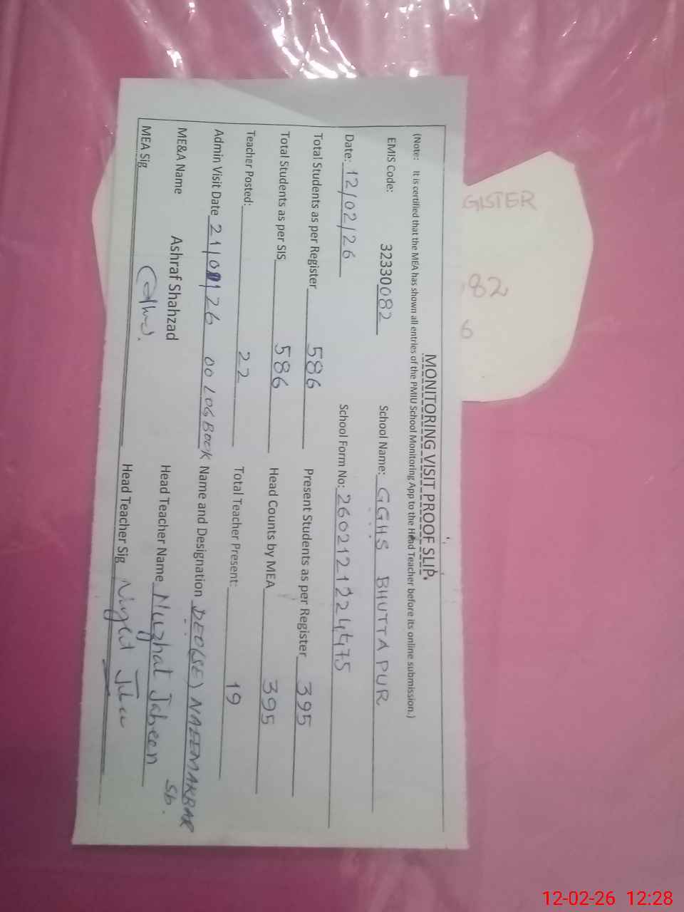 | EMIS Code: 32330082 | Name of School: GGHS BHUTTA PUR | |||