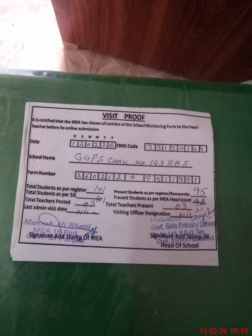 | Attendance Register | Head Teacher | MEA with School | Visit Proof |