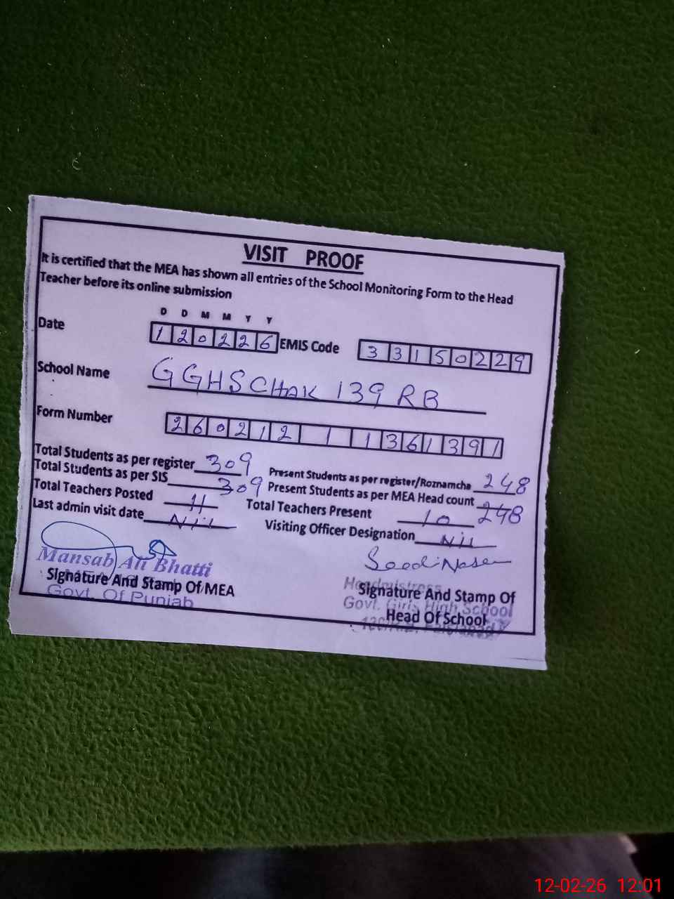 | EMIS Code: 33150229 | Name of School: GGHS CHAK 139 RB CHAK JHUMRA FSD | |||