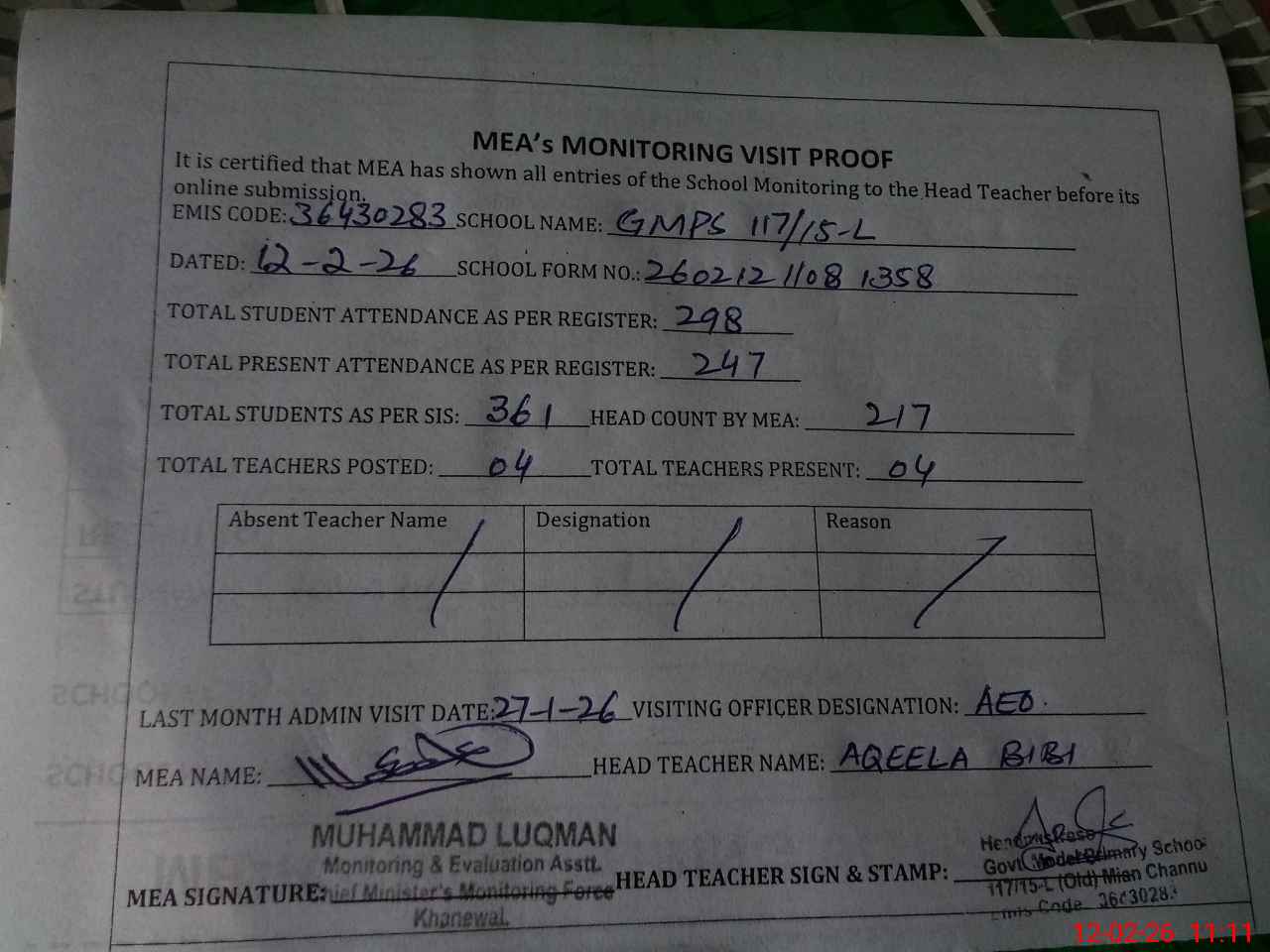 | Attendance Register | Head Teacher | MEA with School | Visit Proof |