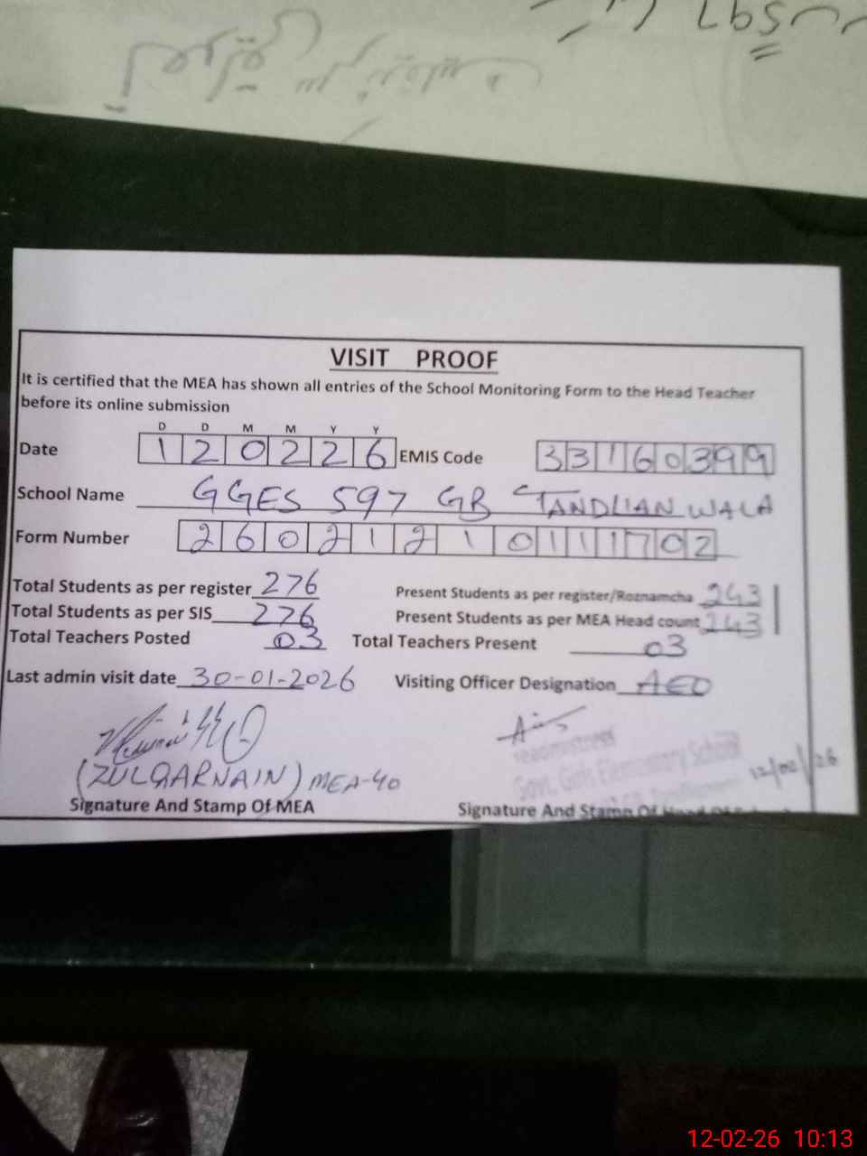 | Certified that this School was Inspected by the Undersigned MEA/DMO Today and the Information Stated Above is as Per Record. | |||||