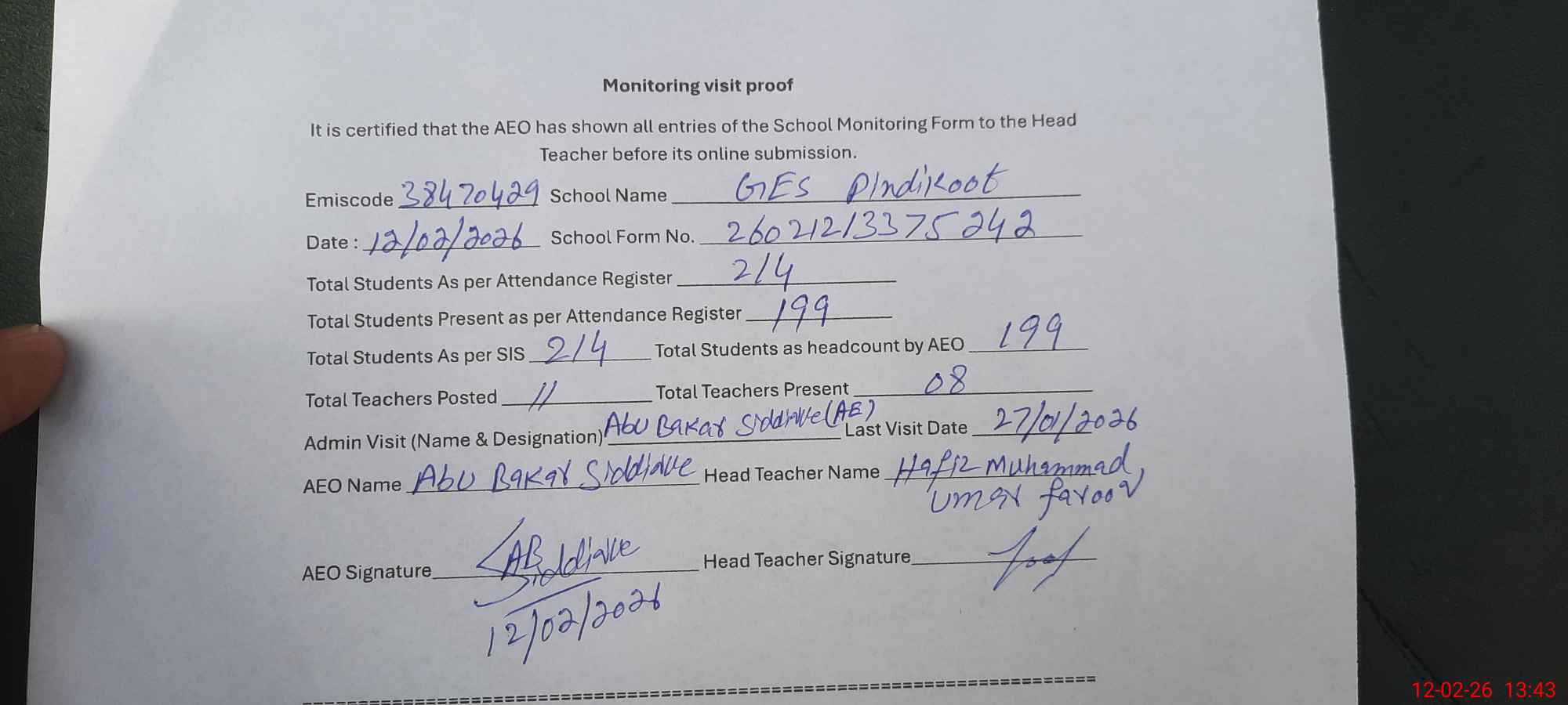 | Attendance Register | Head Teacher | MEA with School | Visit Proof |