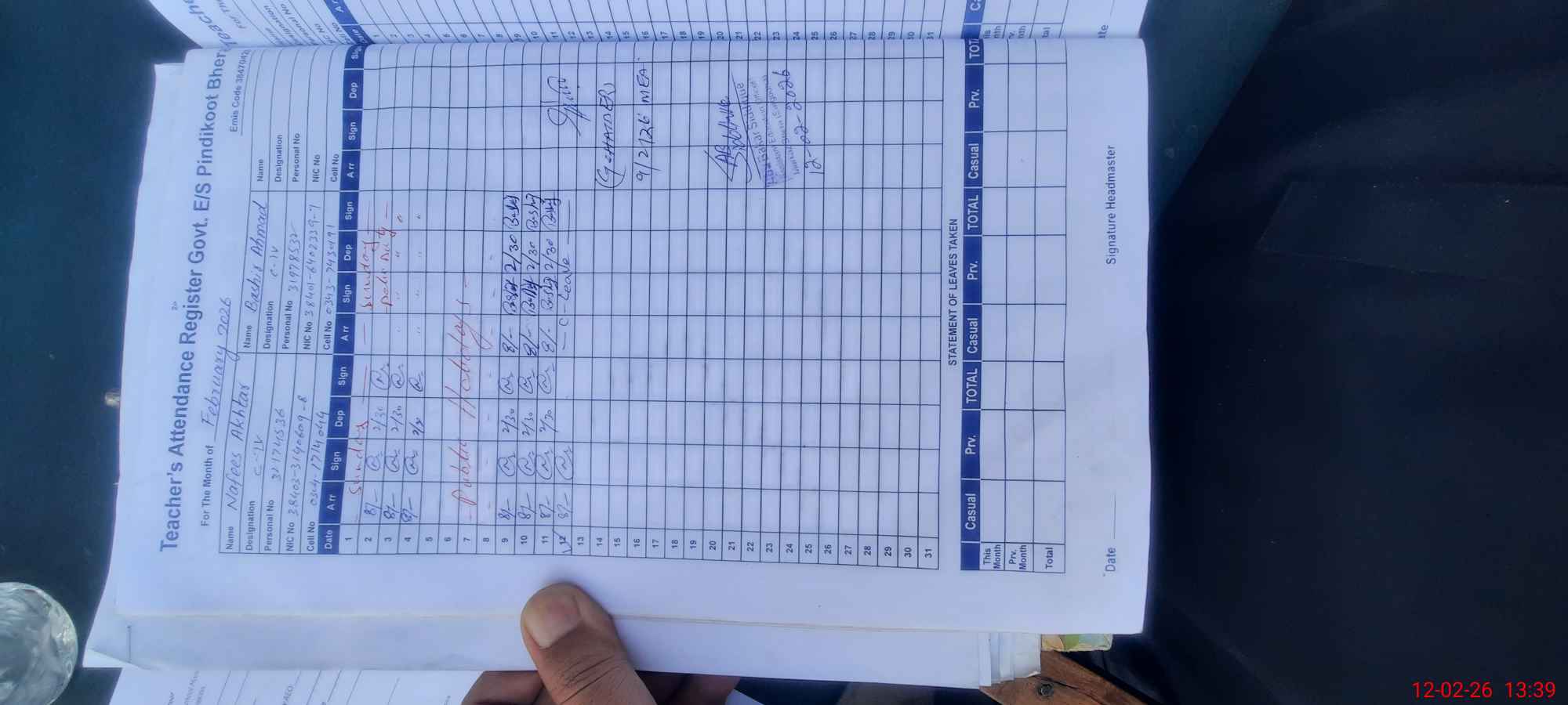 | CNIC | Full Name | Designation | R/C | Absence During Last Calender Month |