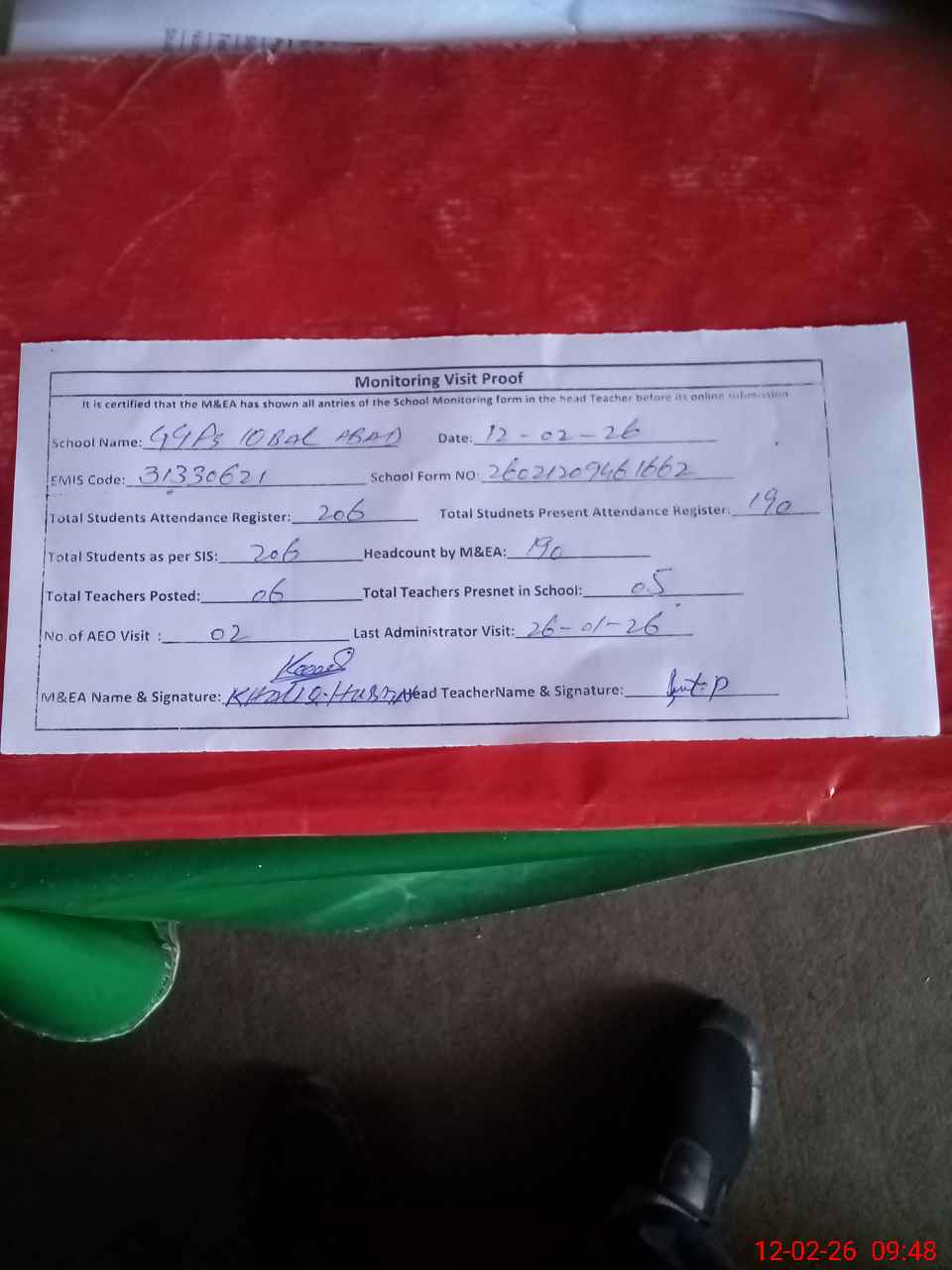 | Attendance Register | Head Teacher | MEA with School | Visit Proof |