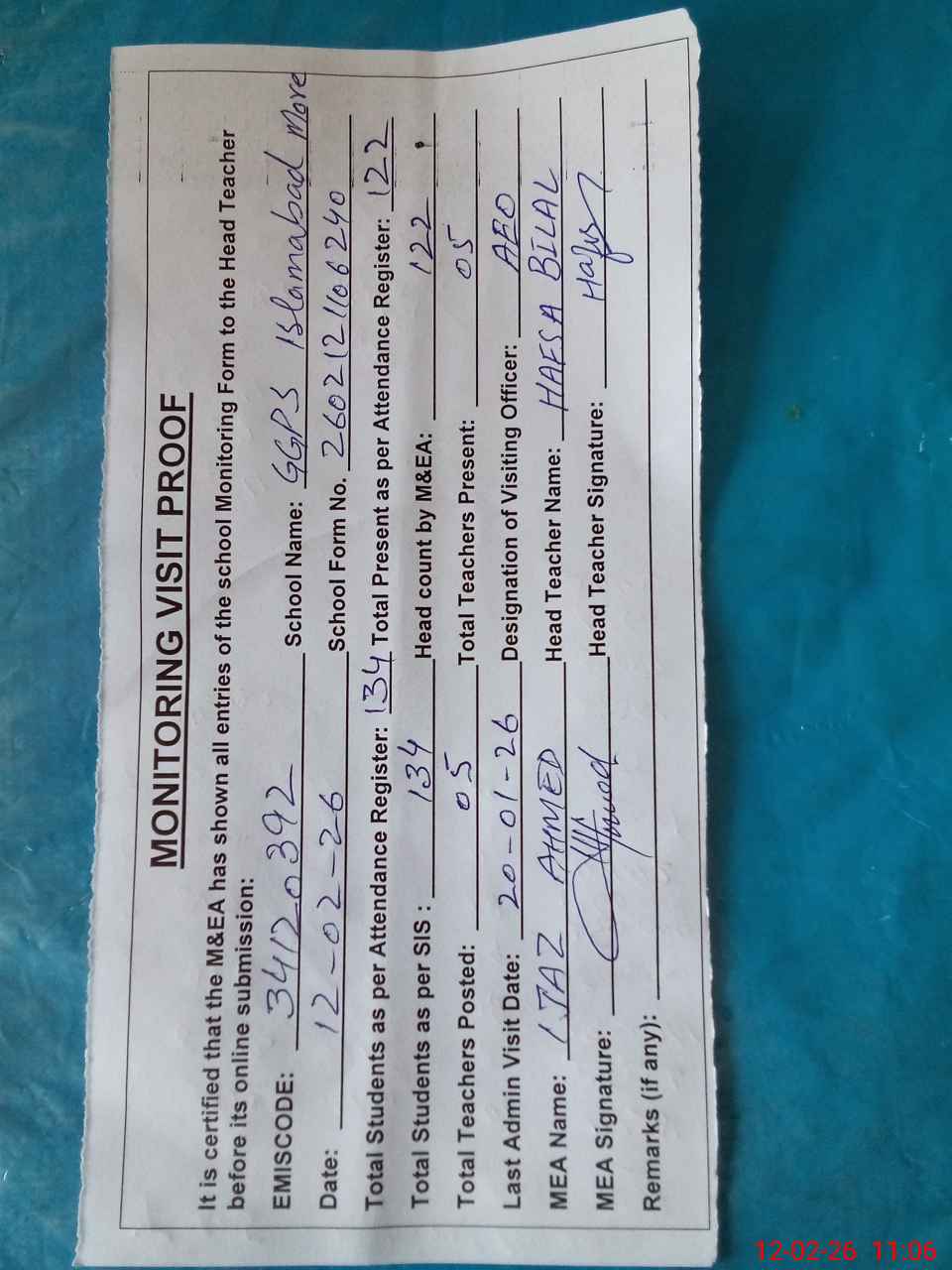 | Attendance Register | Head Teacher | MEA with School | Visit Proof |