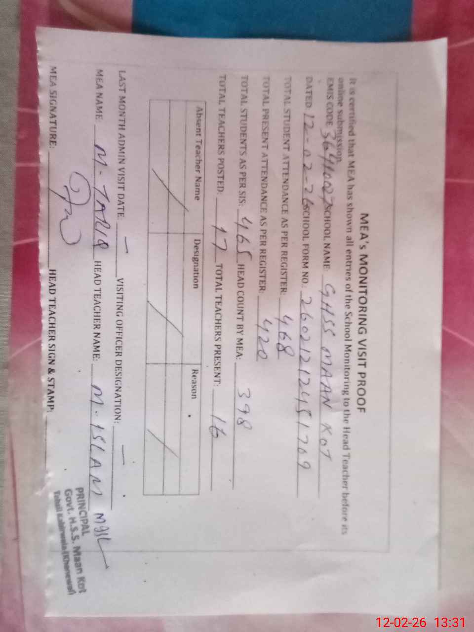 | Attendance Register | Head Teacher | MEA with School | Visit Proof |