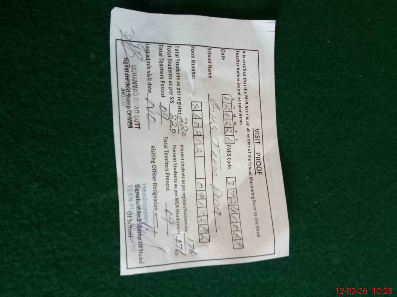 | Certified that this School was Inspected by the Undersigned MEA/DMO Today and the Information Stated Above is as Per Record. | |||||