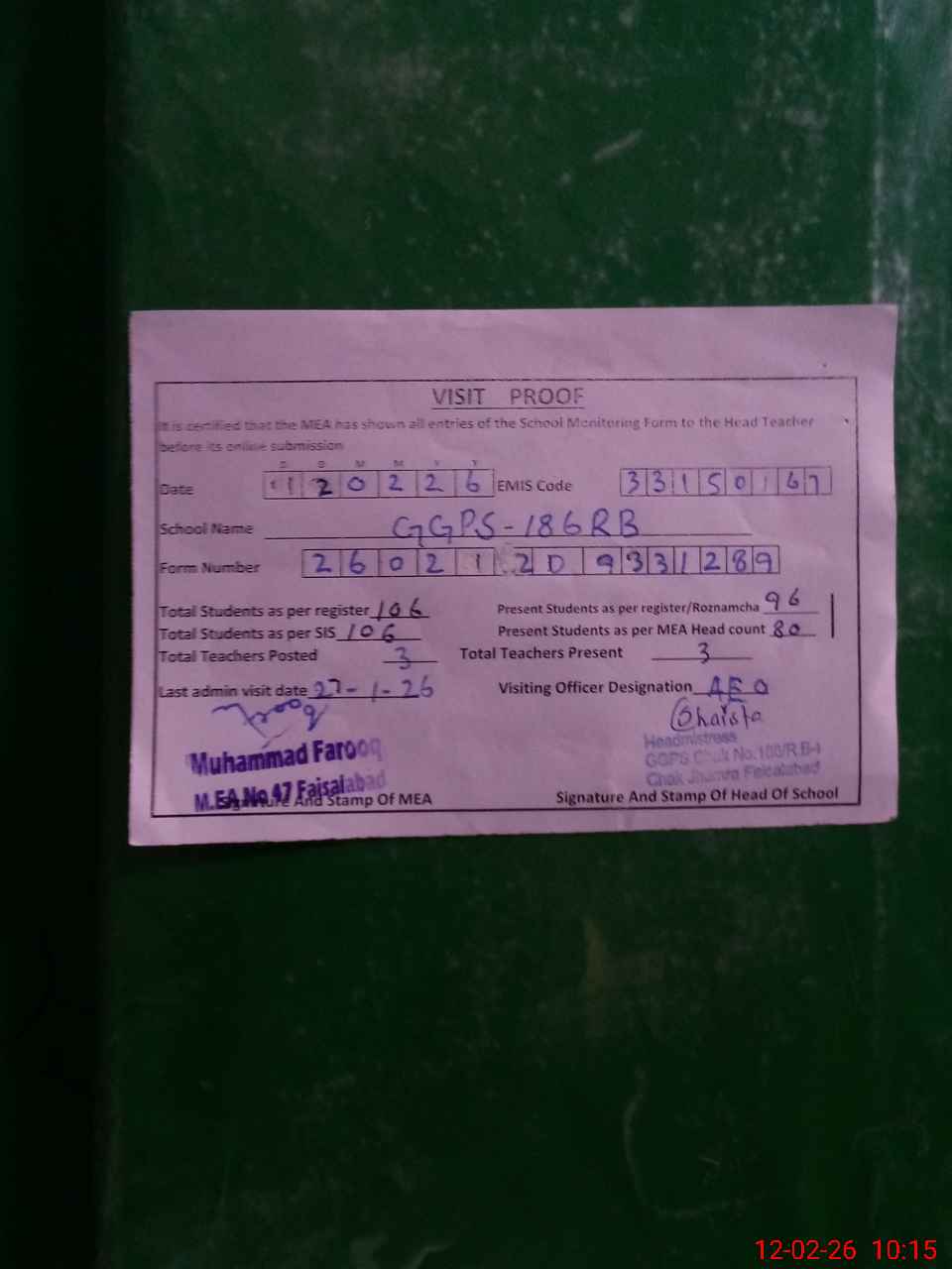 | EMIS Code: 33150167 | Name of School: GGPS CHAK 186 RB II | |||