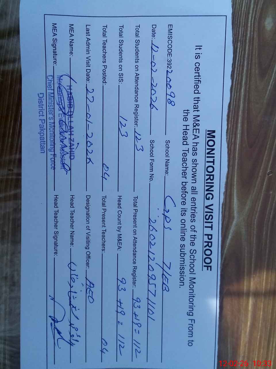 | Attendance Register | Head Teacher | MEA with School | Visit Proof |
