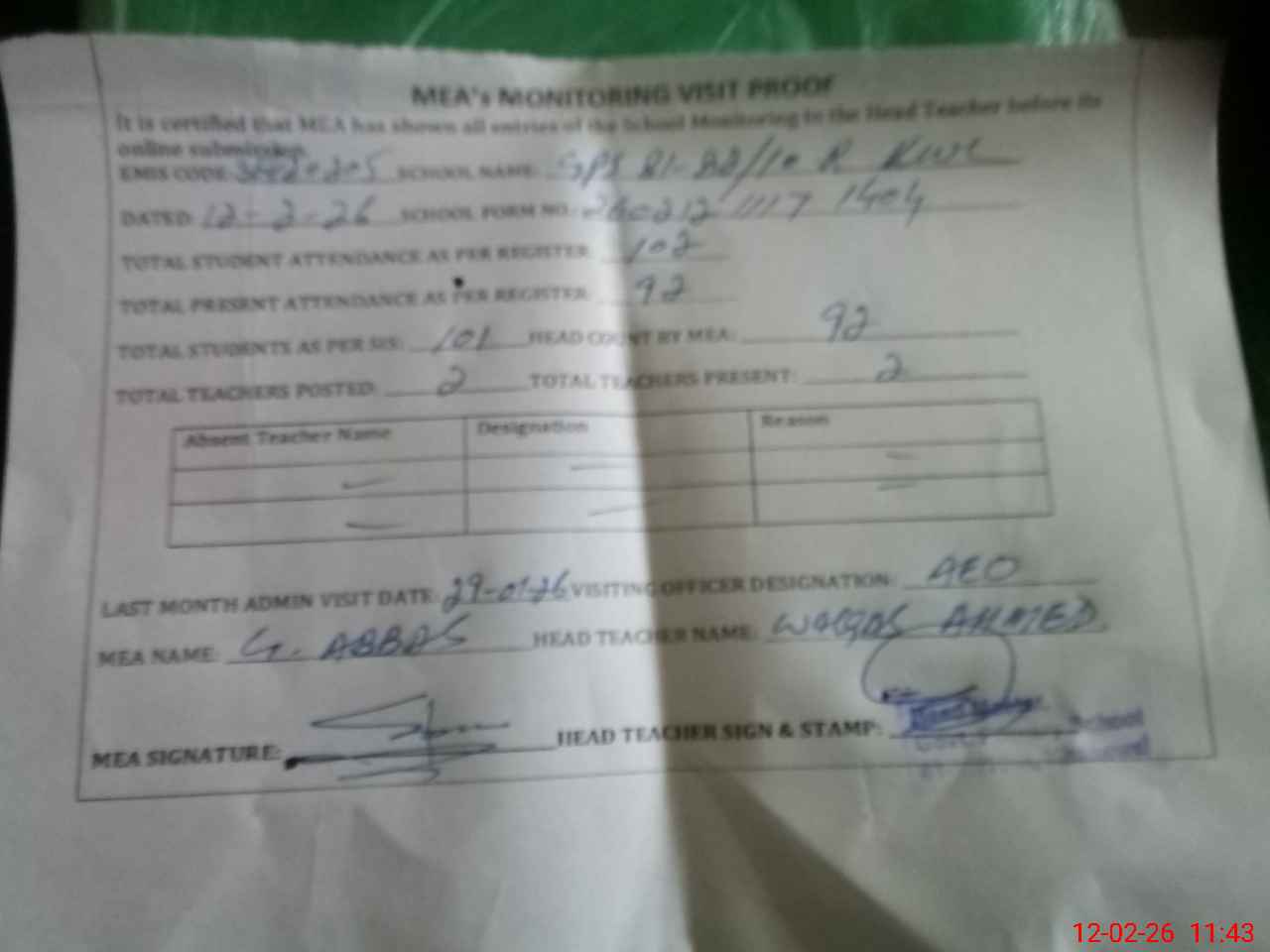 | Attendance Register | Head Teacher | MEA with School | Visit Proof |