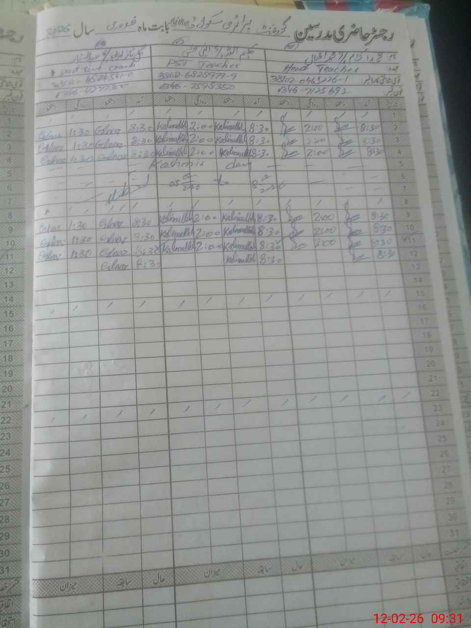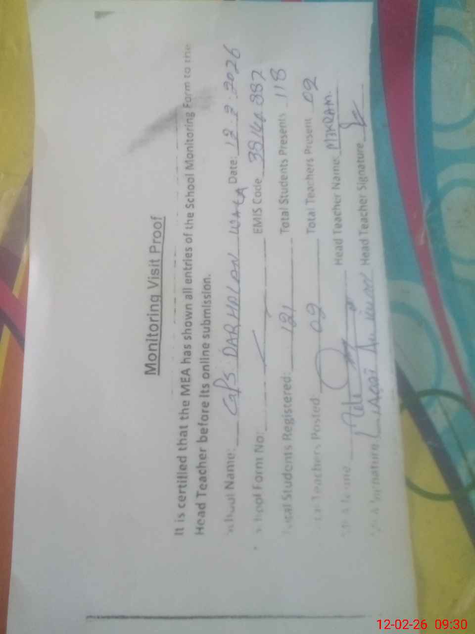 | Attendance Register | Head Teacher | MEA with School | Visit Proof |