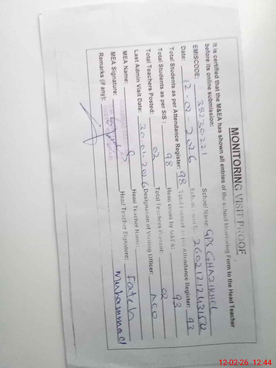 | Remarks (Use Separate Page if Required): Students on SIS Qty 98 Last admin visit 30 January 2026 by AEO | |||||