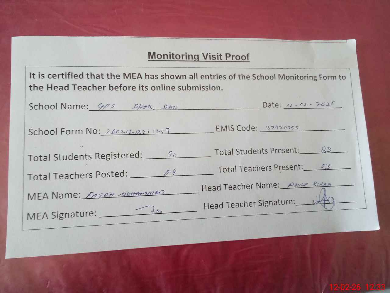 | Attendance Register | Head Teacher | MEA with School | Visit Proof |