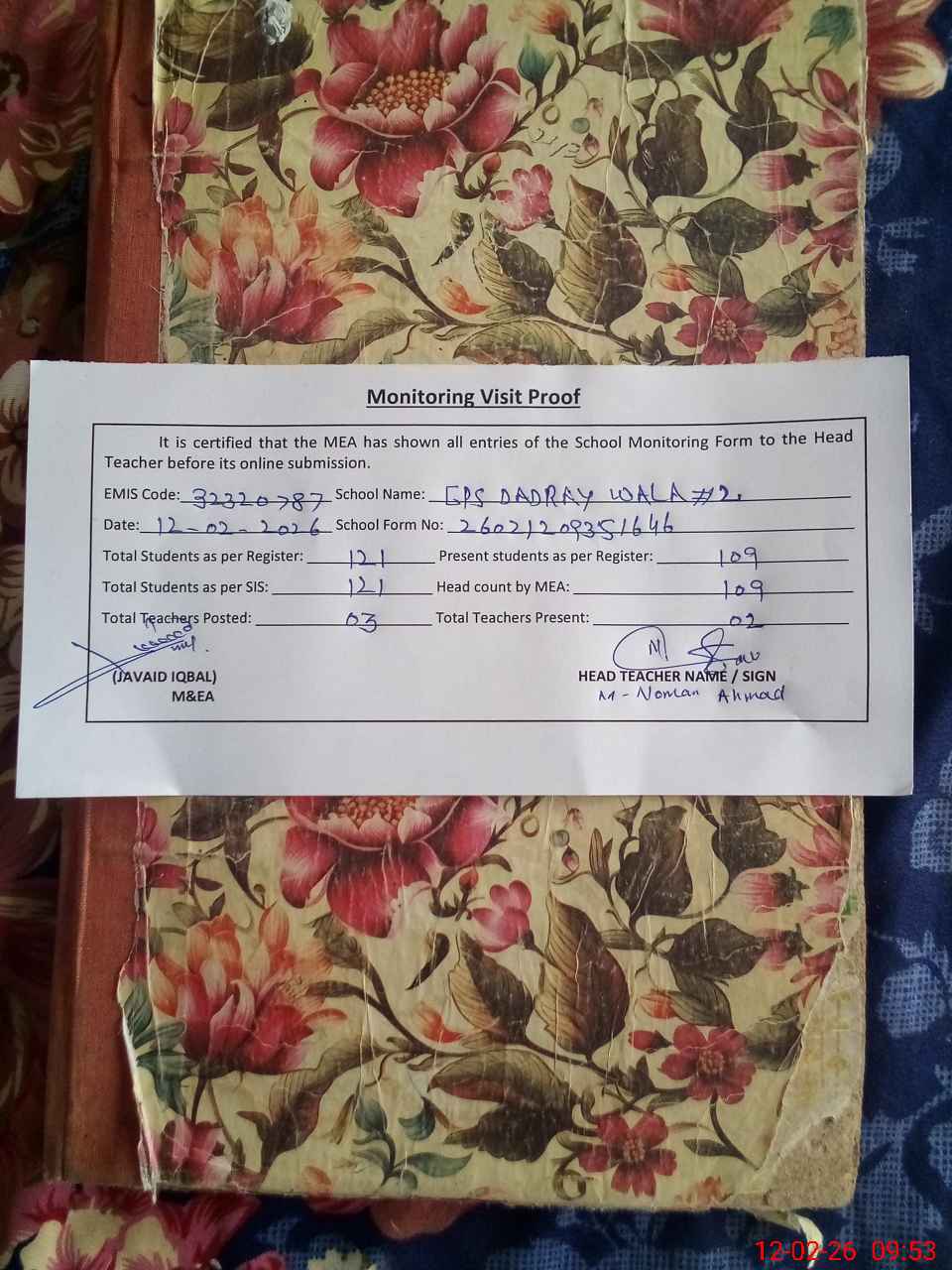 | Attendance Register | Head Teacher | MEA with School | Visit Proof |