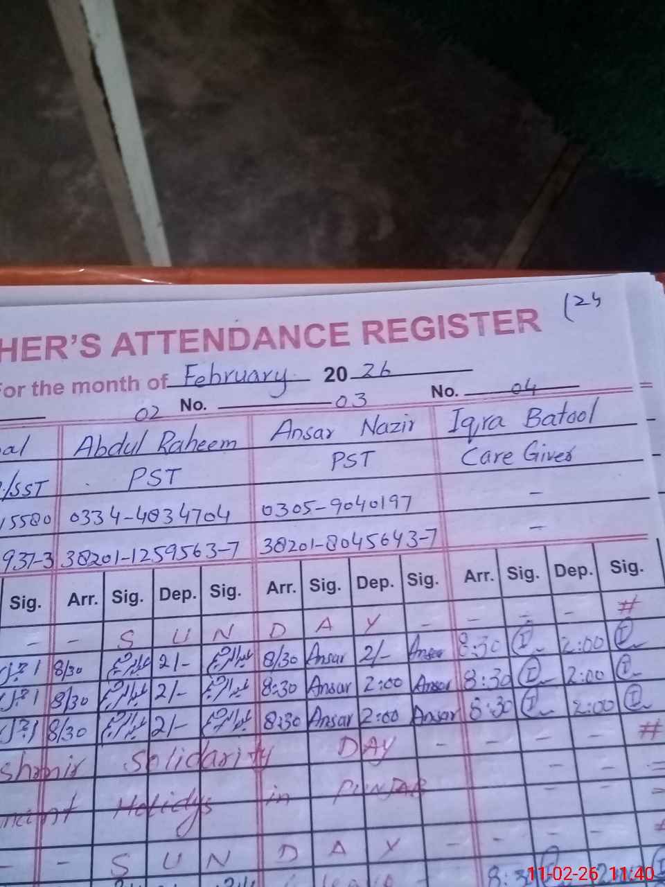 | CNIC | Full Name | Designation | R/C | Absence During Last Calender Month |