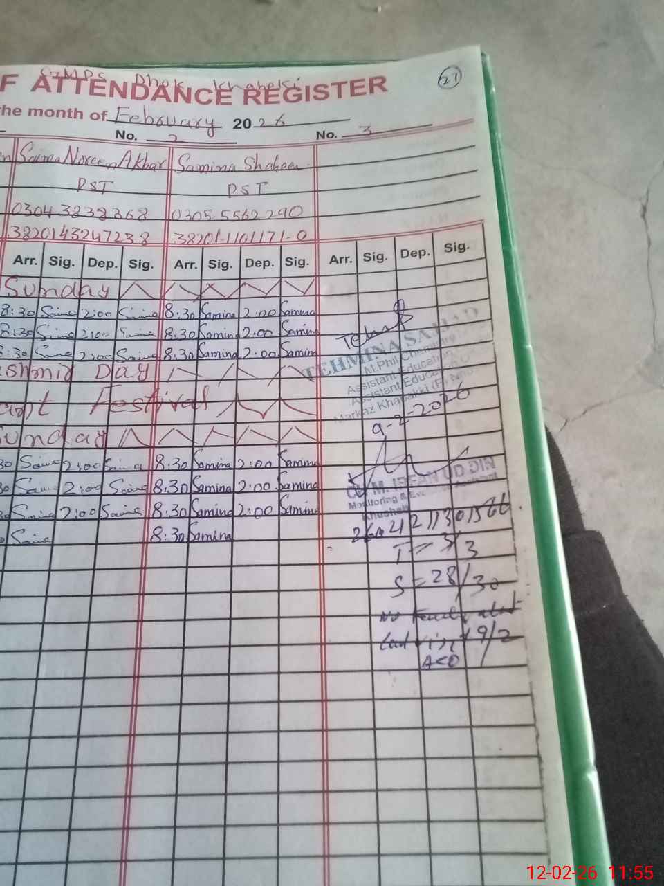 | Remarks (Use Separate Page if Required): gmps dhok khabuki student on sis 30 student on register 30 head count 28 no teacher absent last visit aeo 9th Feb water sources needed | |||||