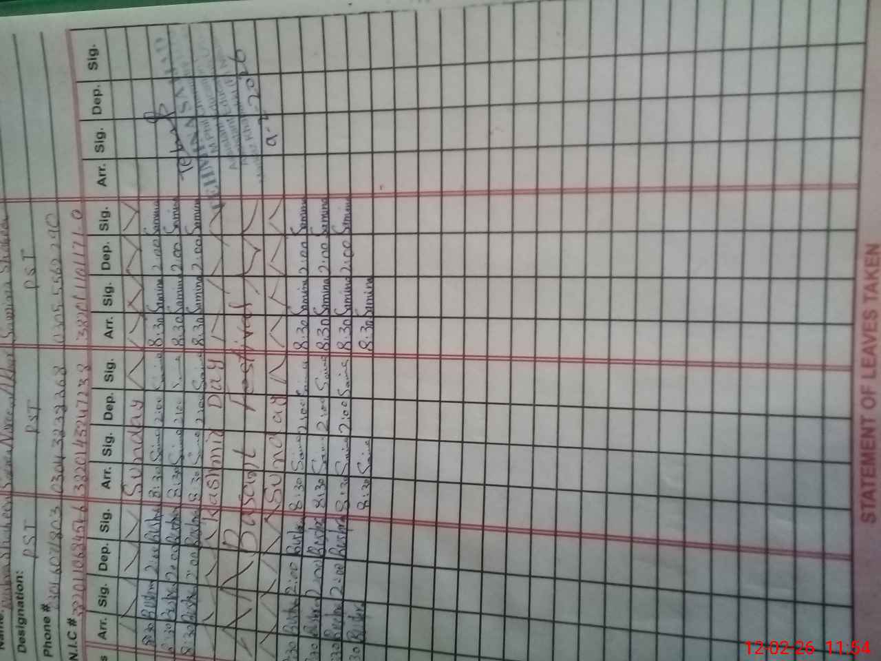 | CNIC | Full Name | Designation | R/C | Absence During Last Calender Month |