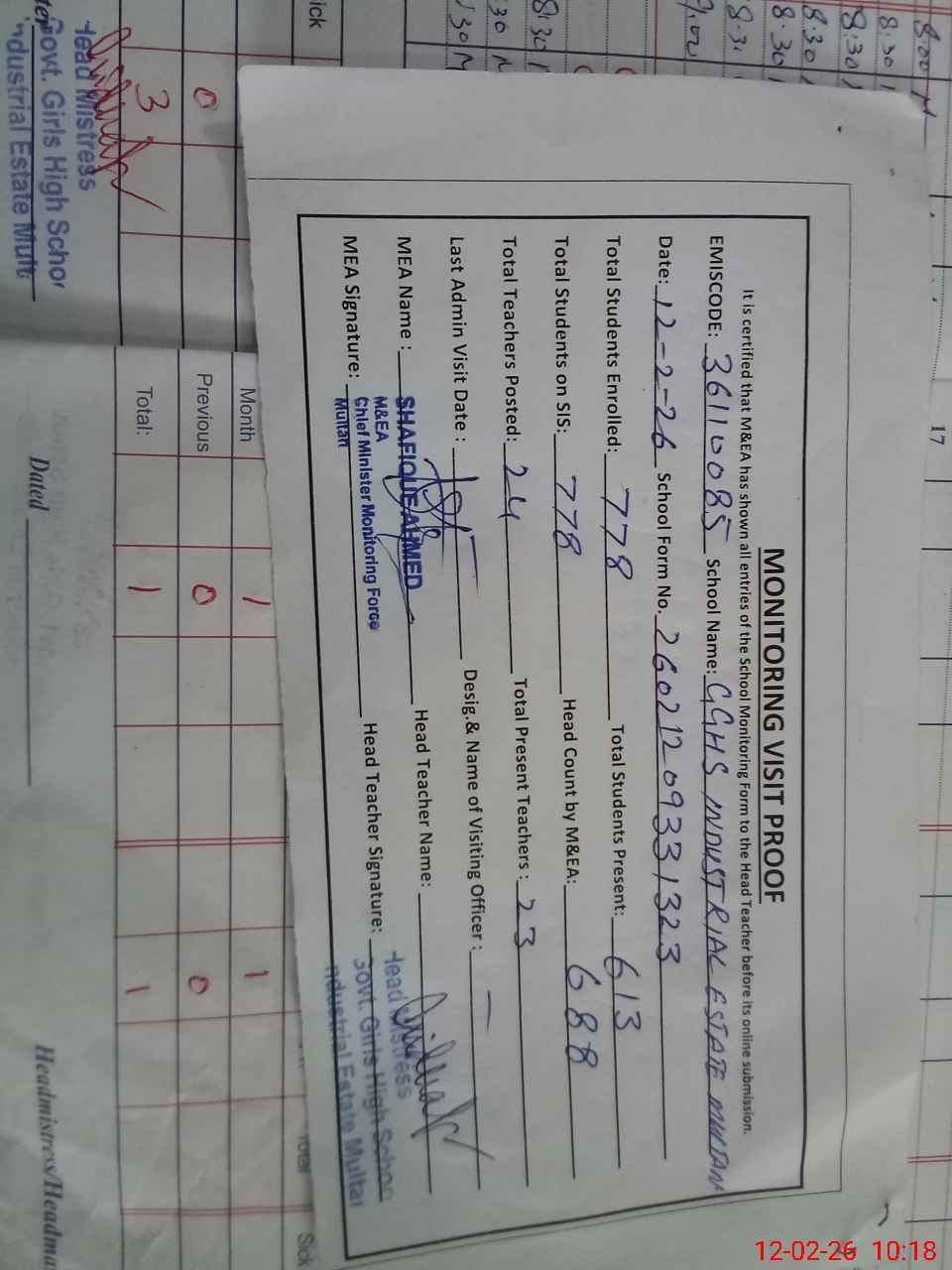 | Certified that this School was Inspected by the Undersigned MEA/DMO Today and the Information Stated Above is as Per Record. | |||||
