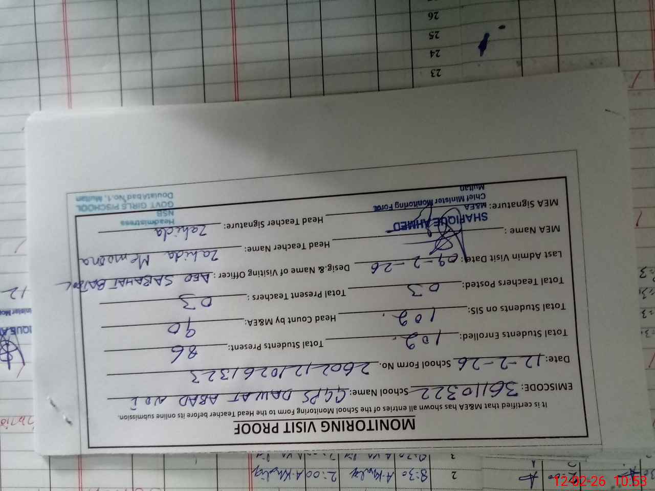 | Monitoring Date: 12-02-2026 | Start Time: 12-02-2026 10:26 AM | End Time: 12-02-2026 10:53 AM | Name of MEA: SH**** AH**** | |