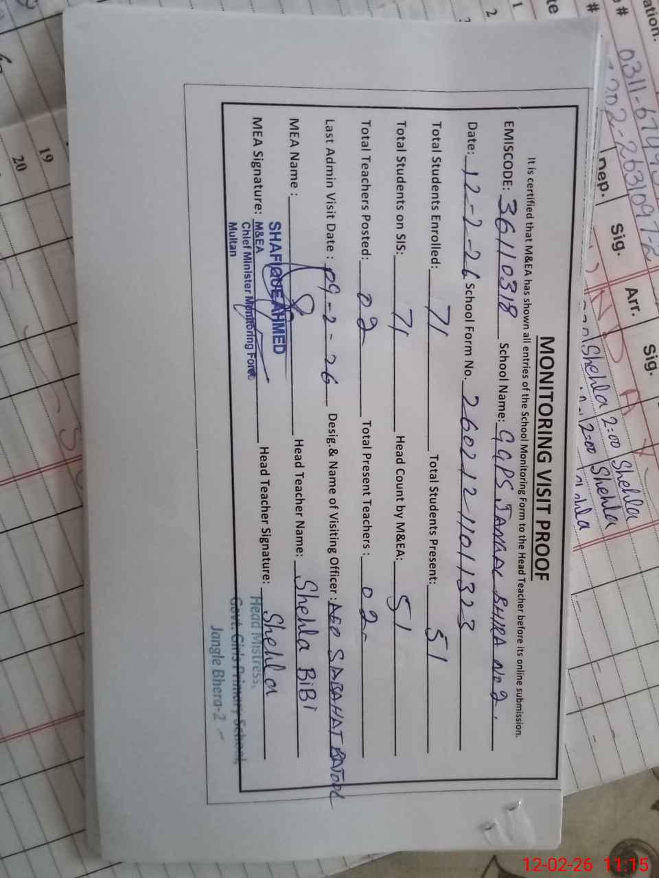 | Certified that this School was Inspected by the Undersigned MEA/DMO Today and the Information Stated Above is as Per Record. | |||||