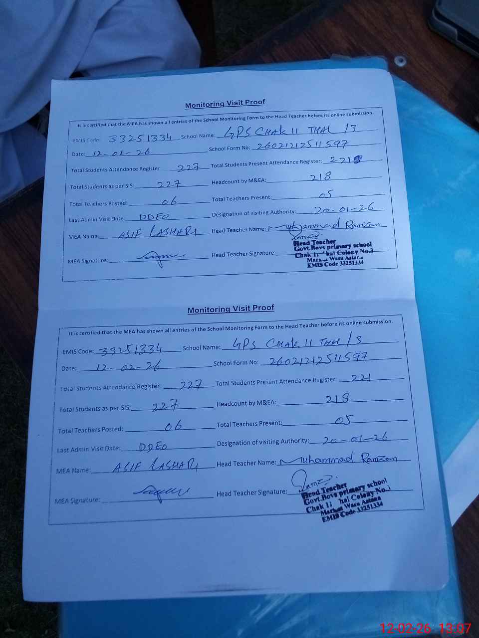 | EMIS Code: 33251334 | Name of School: GPS CHAK 11 THAL COLONY NO 3 | |||
