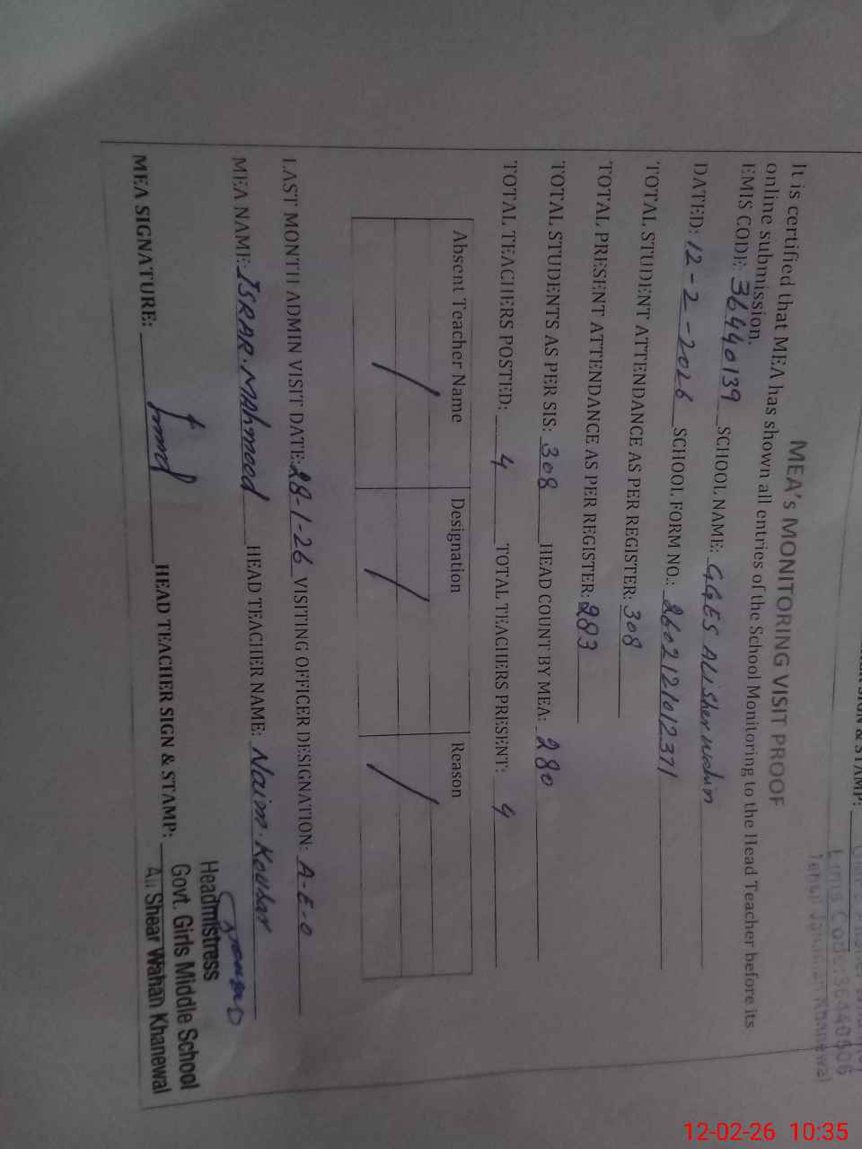 | Attendance Register | Head Teacher | MEA with School | Visit Proof |