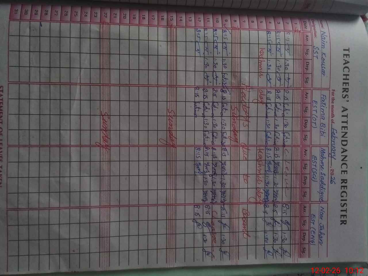 | No. of Students Present - Male | 0 | 0 | 0 | 0 | 0 | 0 | 0 | 0 | 0 | 0 | 0 | |||||