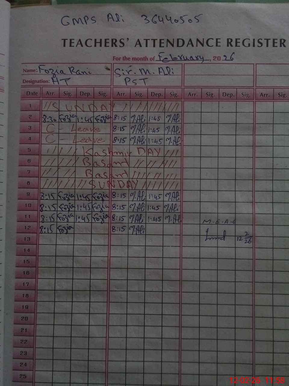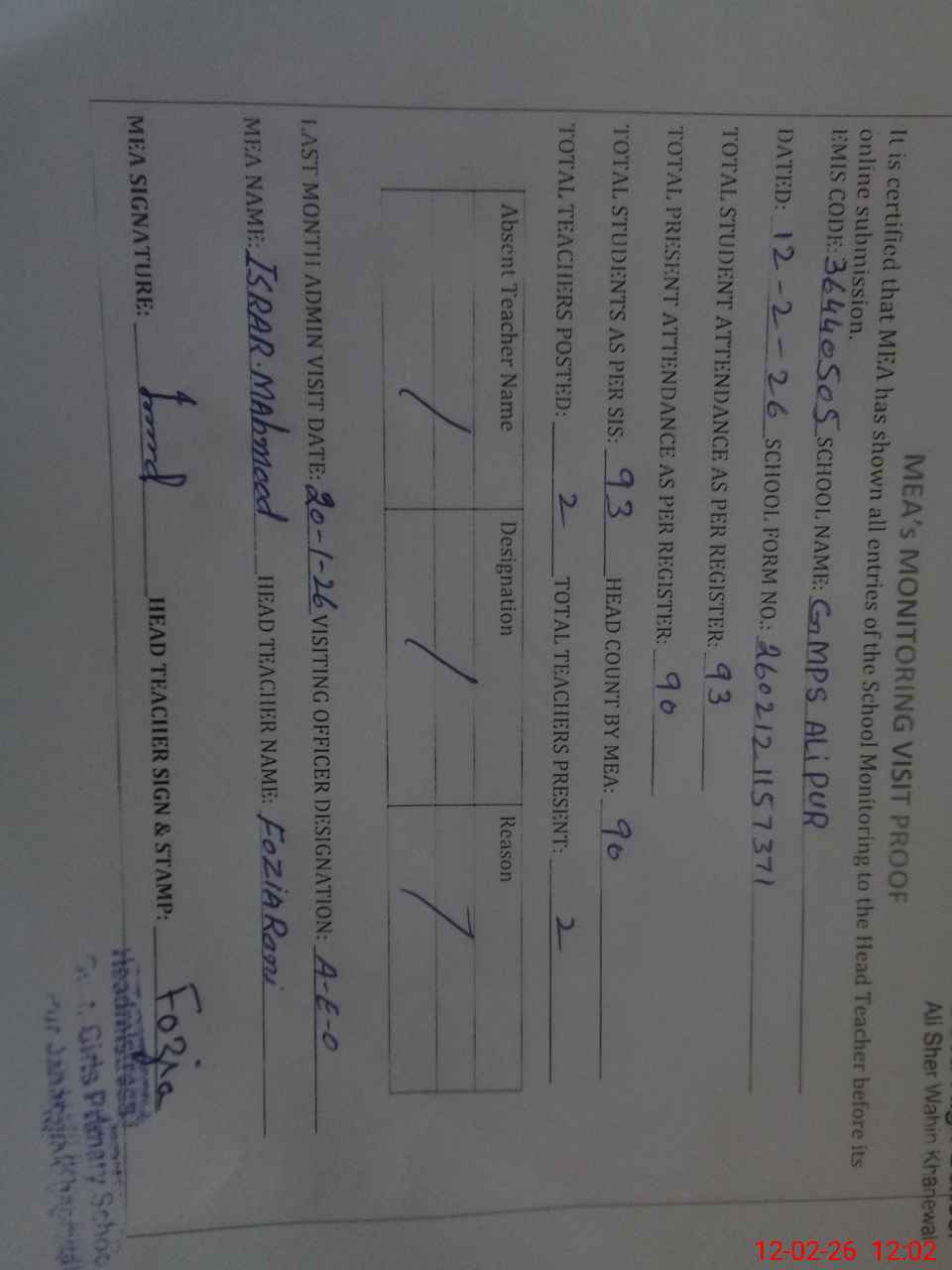 | Attendance Register | Head Teacher | MEA with School | Visit Proof |