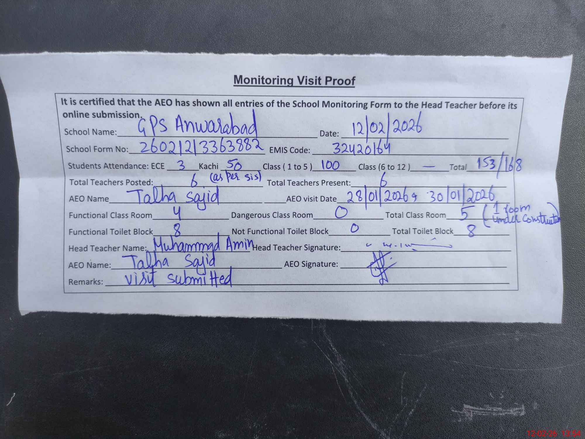 | EMIS Code: 32420164 | Name of School: GPS ANWAR ABAD | |||
