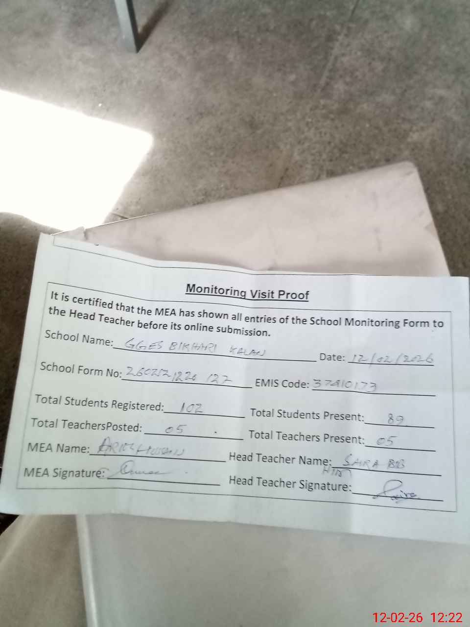 | Attendance Register | Head Teacher | MEA with School | Visit Proof |