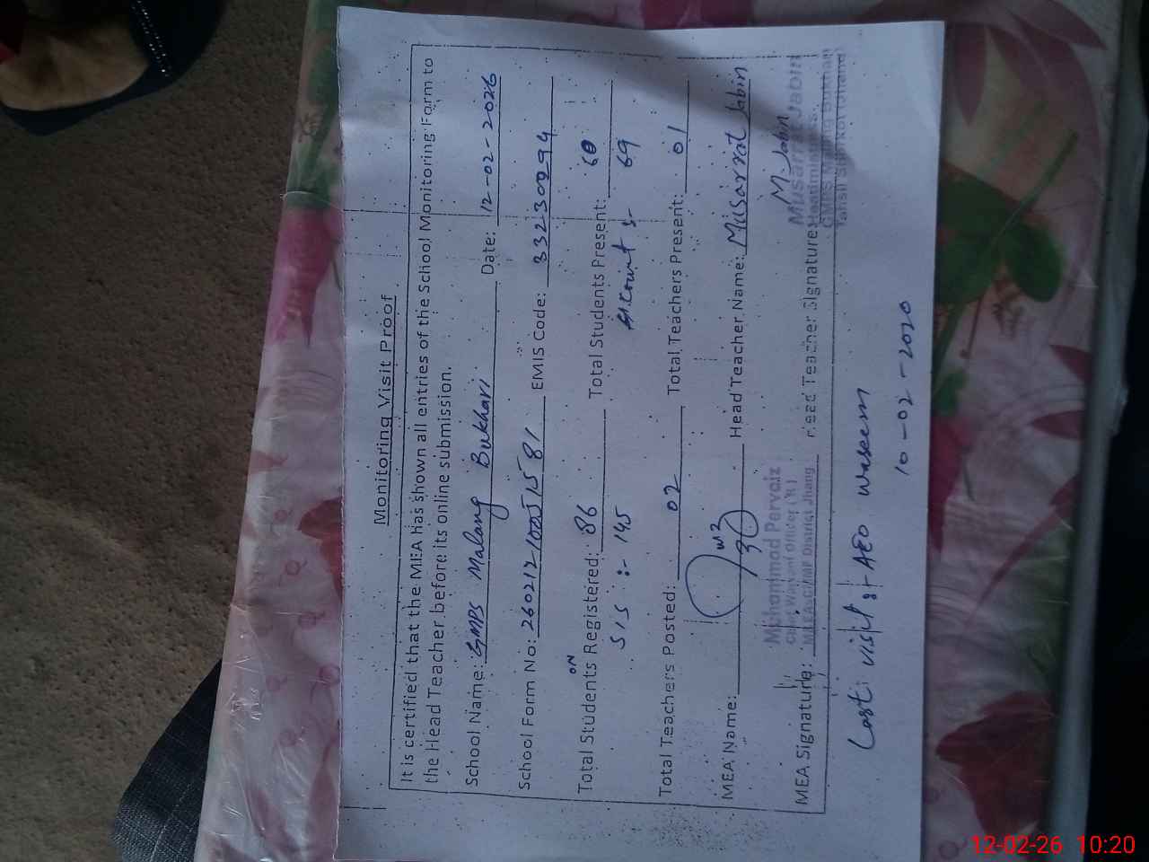 | Certified that this School was Inspected by the Undersigned MEA/DMO Today and the Information Stated Above is as Per Record. | |||||
