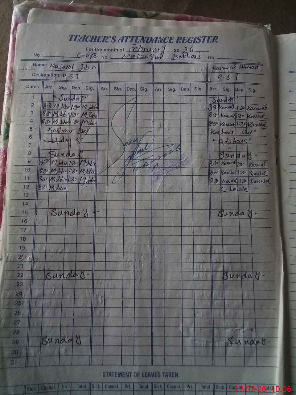 | CNIC | Full Name | Designation | R/C | Absence During Last Calender Month |