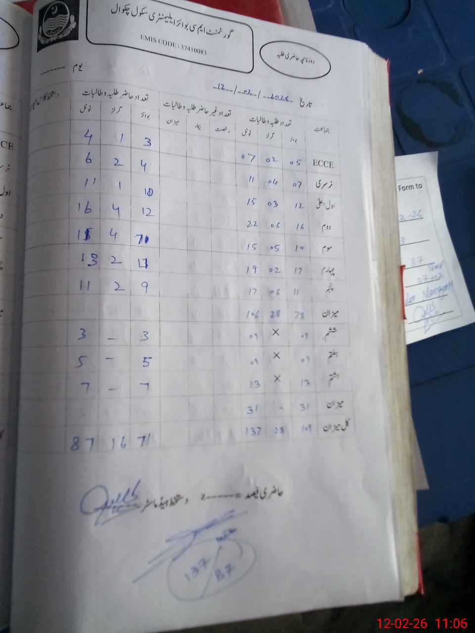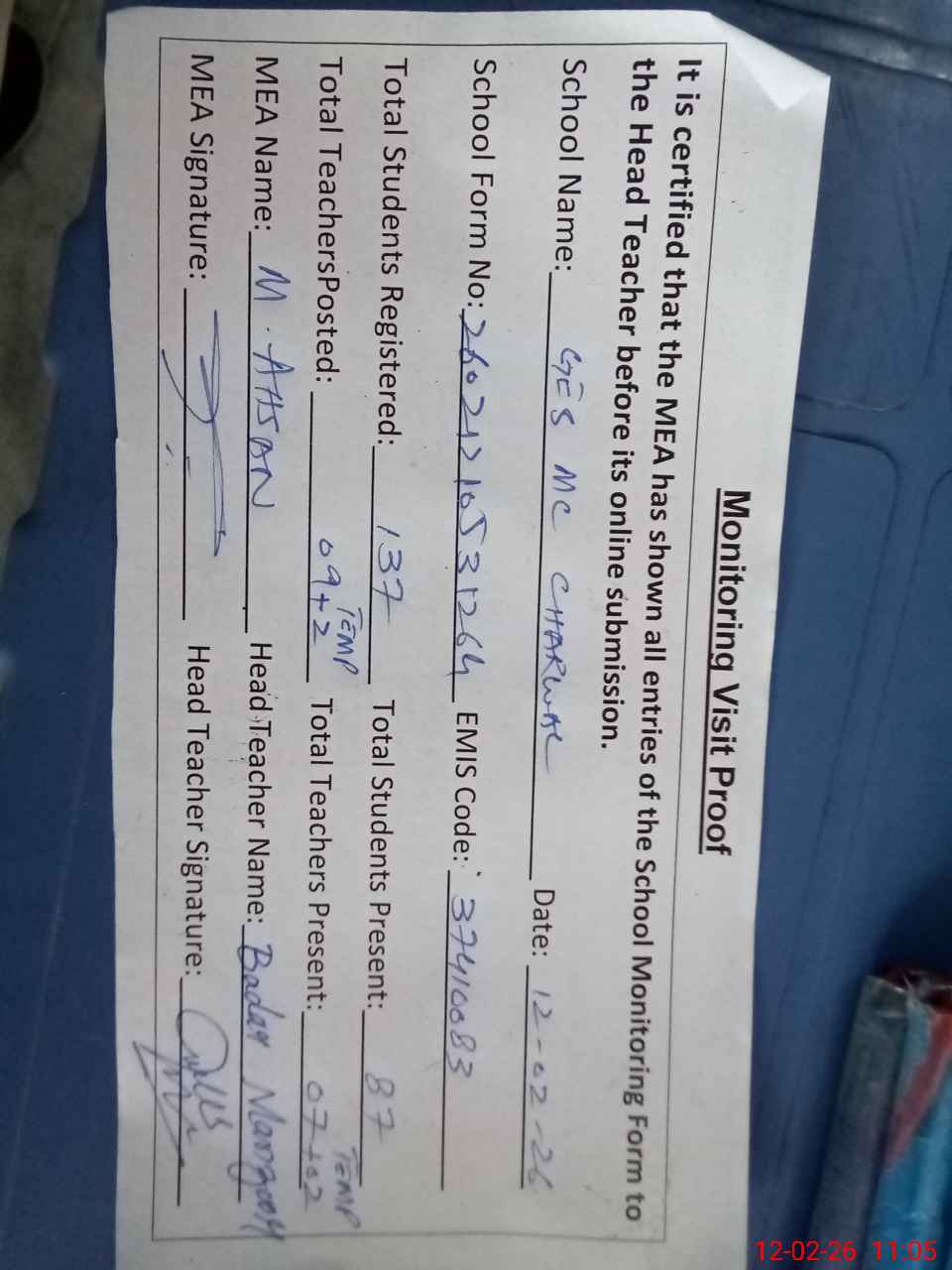 | Attendance Register | Head Teacher | MEA with School | Visit Proof |