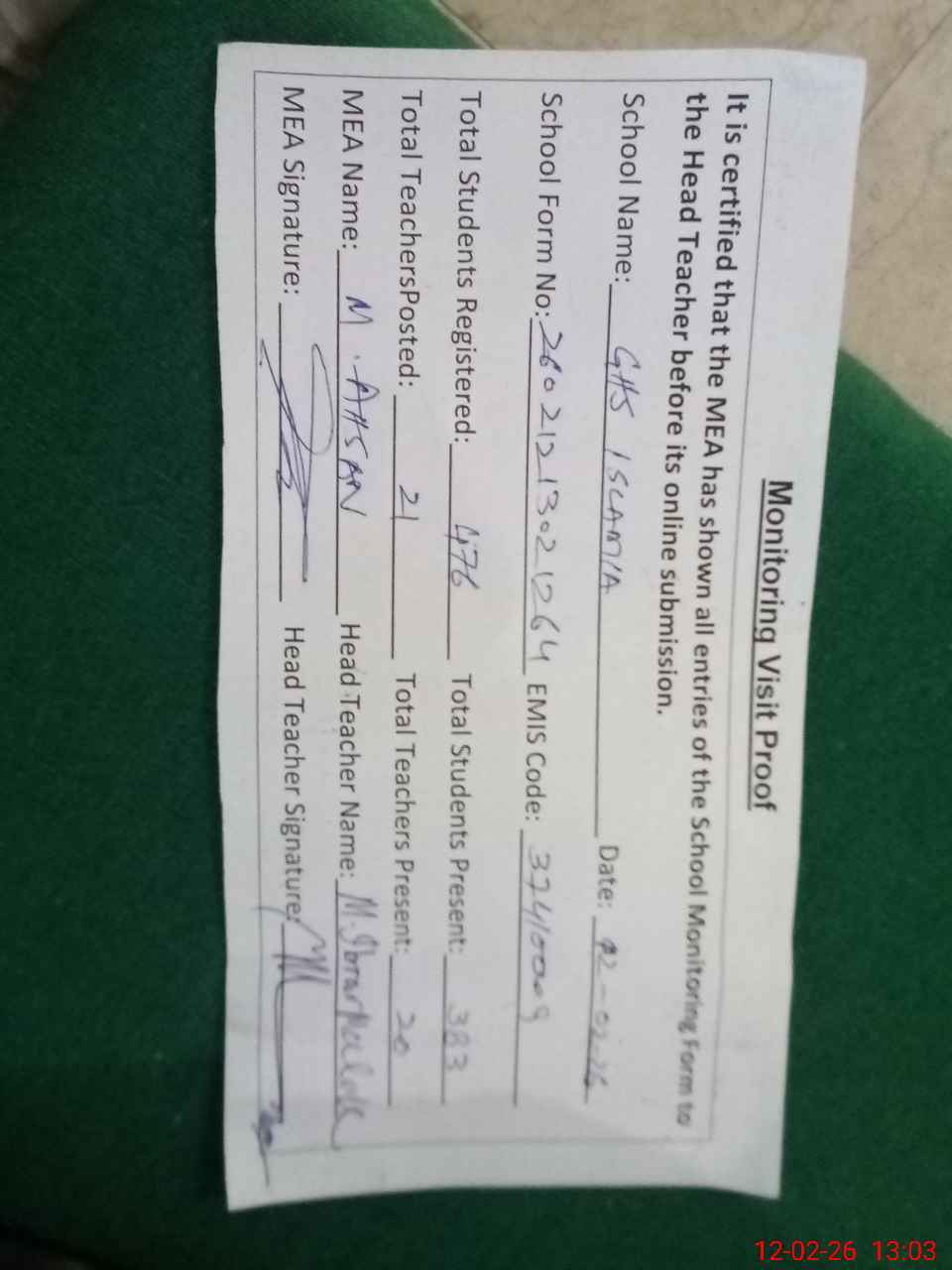 | Attendance Register | Head Teacher | MEA with School | Visit Proof |