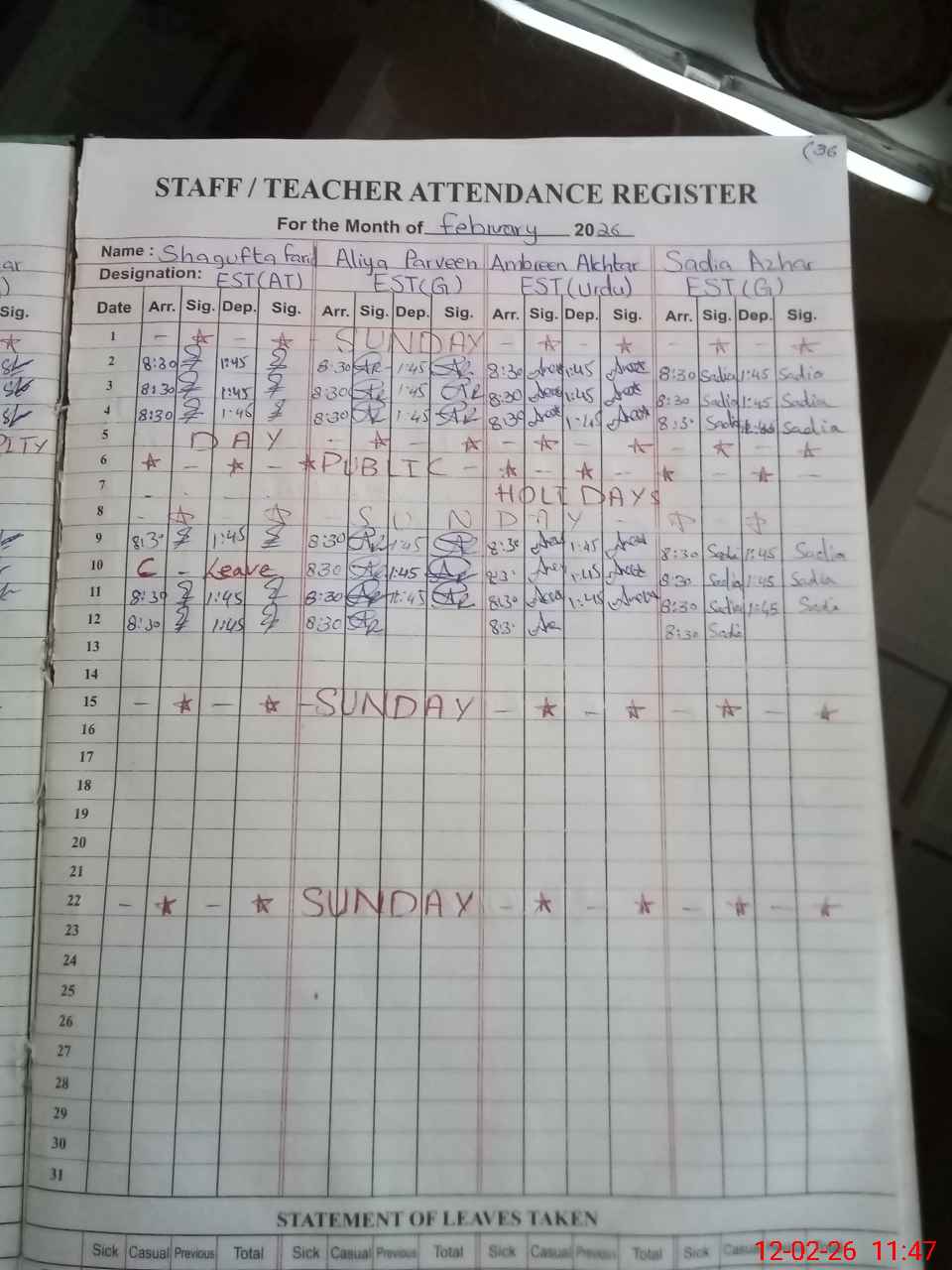 | Leave | Duty | Absent | Maternity | Medical | Ex- Pak |