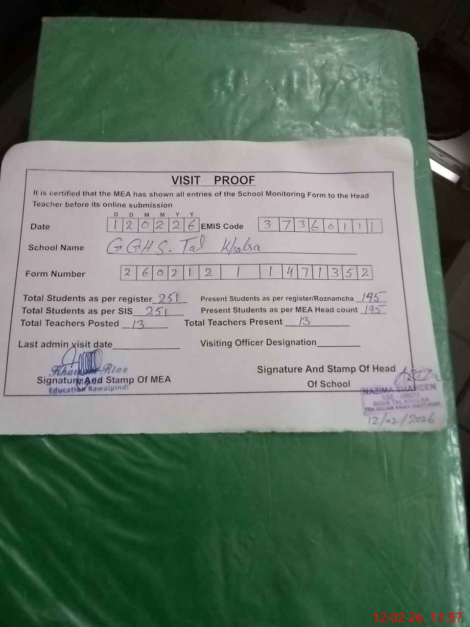 | Attendance Register | Head Teacher | MEA with School | Visit Proof |
