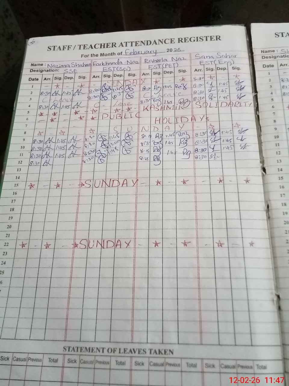 | CNIC | Full Name | Designation | R/C | Absence During Last Calender Month |