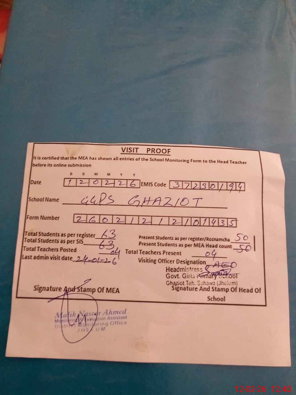 | Attendance Register | Head Teacher | MEA with School | Visit Proof |