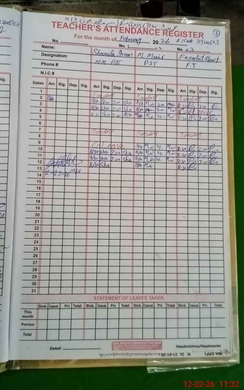 | Name: SH**** IR**** Designation: (School Headmaster's/Headmistress's) PST Phone/Cell Number: 03**** |