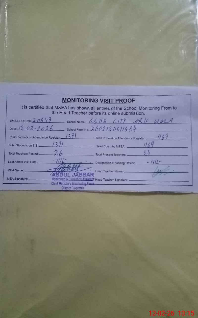 | EMIS Code: 39220549 | Name of School: GGHS CITY ARIFWALA | |||