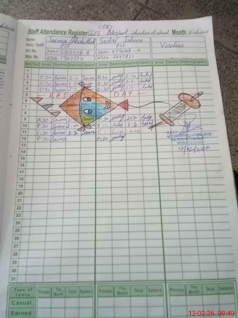| Remarks (Use Separate Page if Required): Rashida nazir sst absent at 0942 hrs | |||||