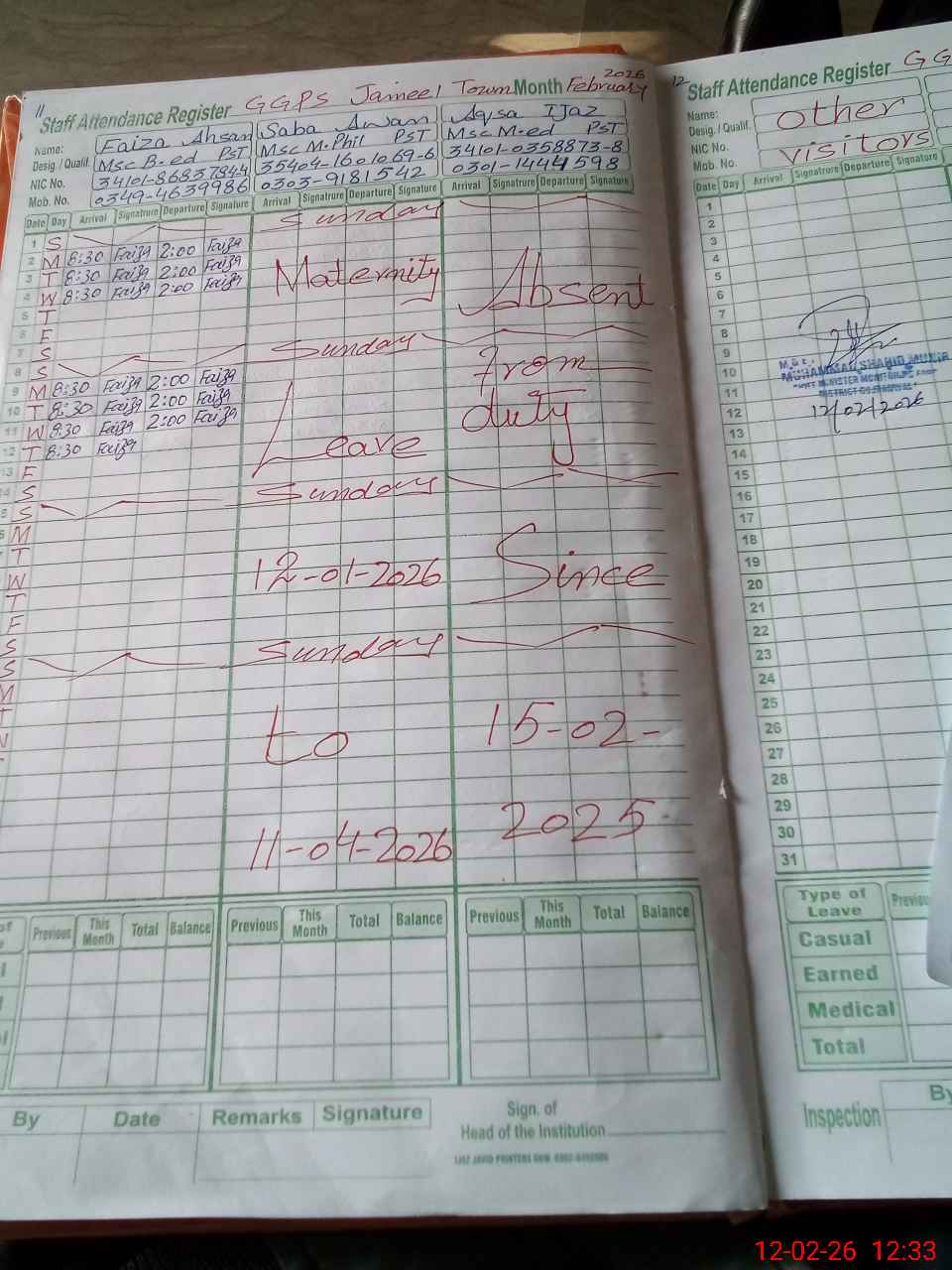 | Remarks (Use Separate Page if Required): Aqsa ijaz pst absent wef 15, February 2025 | |||||