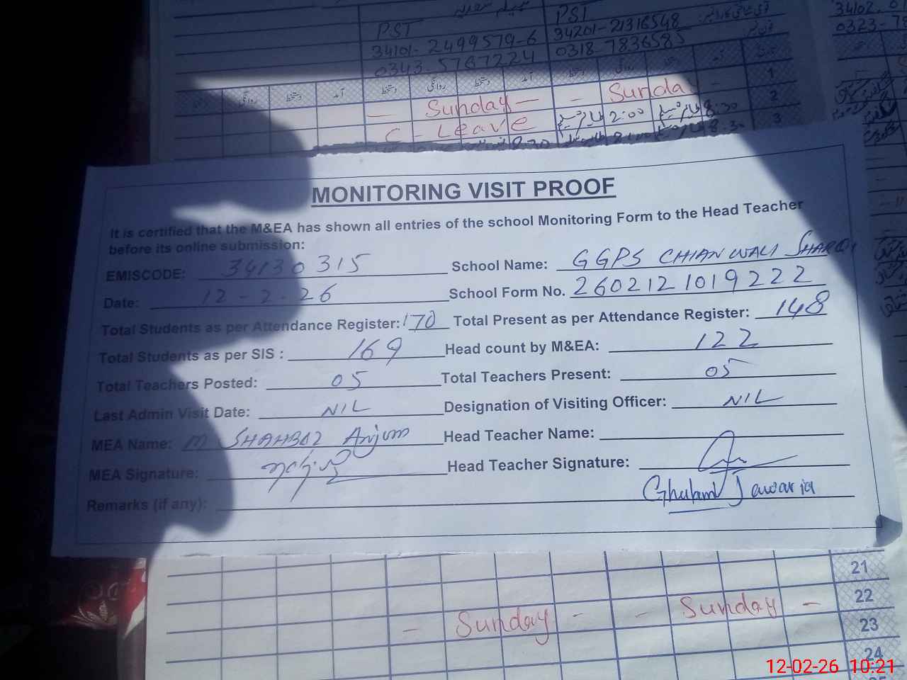 | Attendance Register | Head Teacher | MEA with School | Visit Proof |