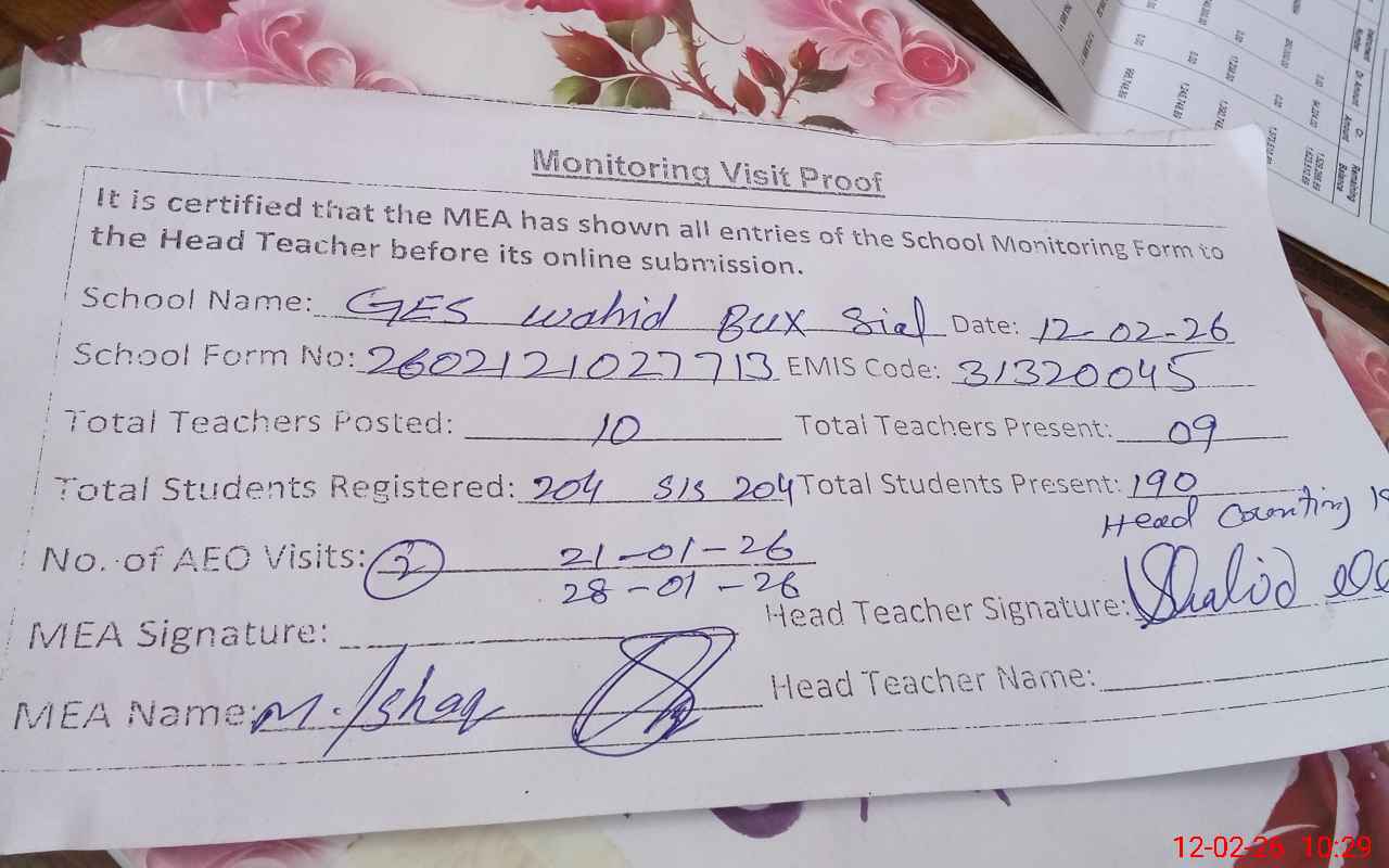 | EMIS Code: 31320045 | Name of School: GES WAHID BAKHSH SIAL | |||