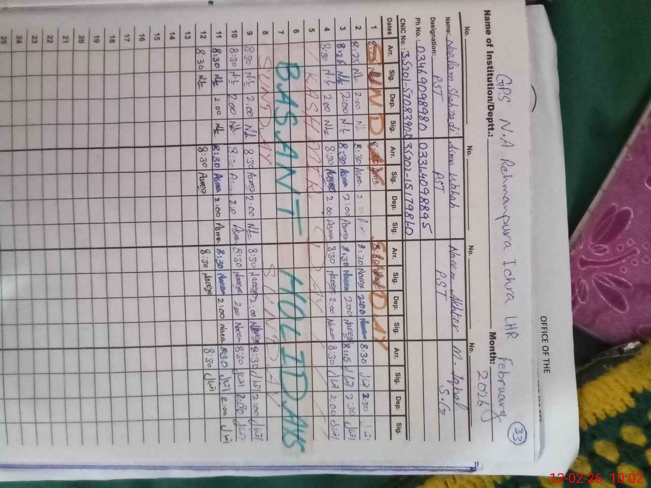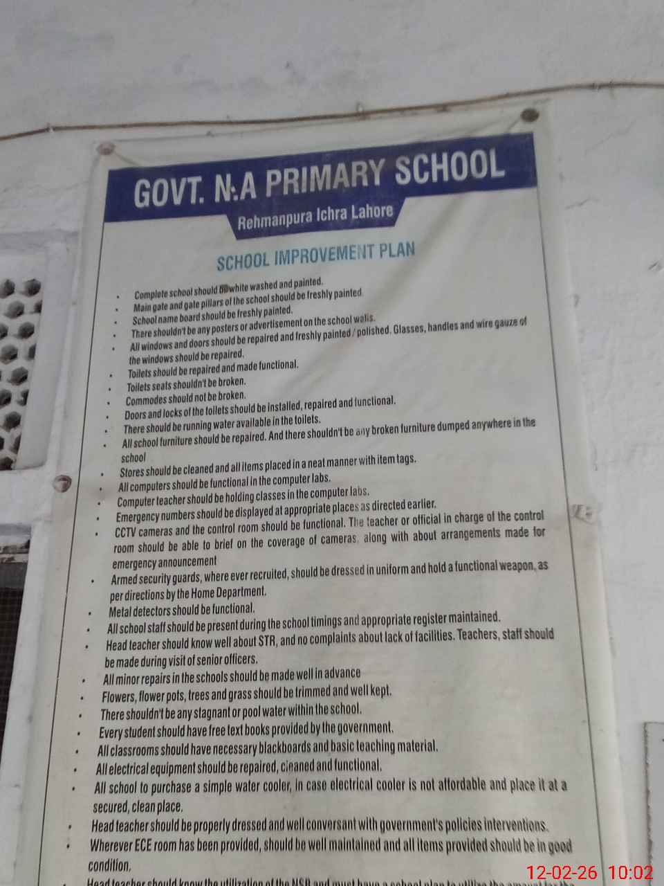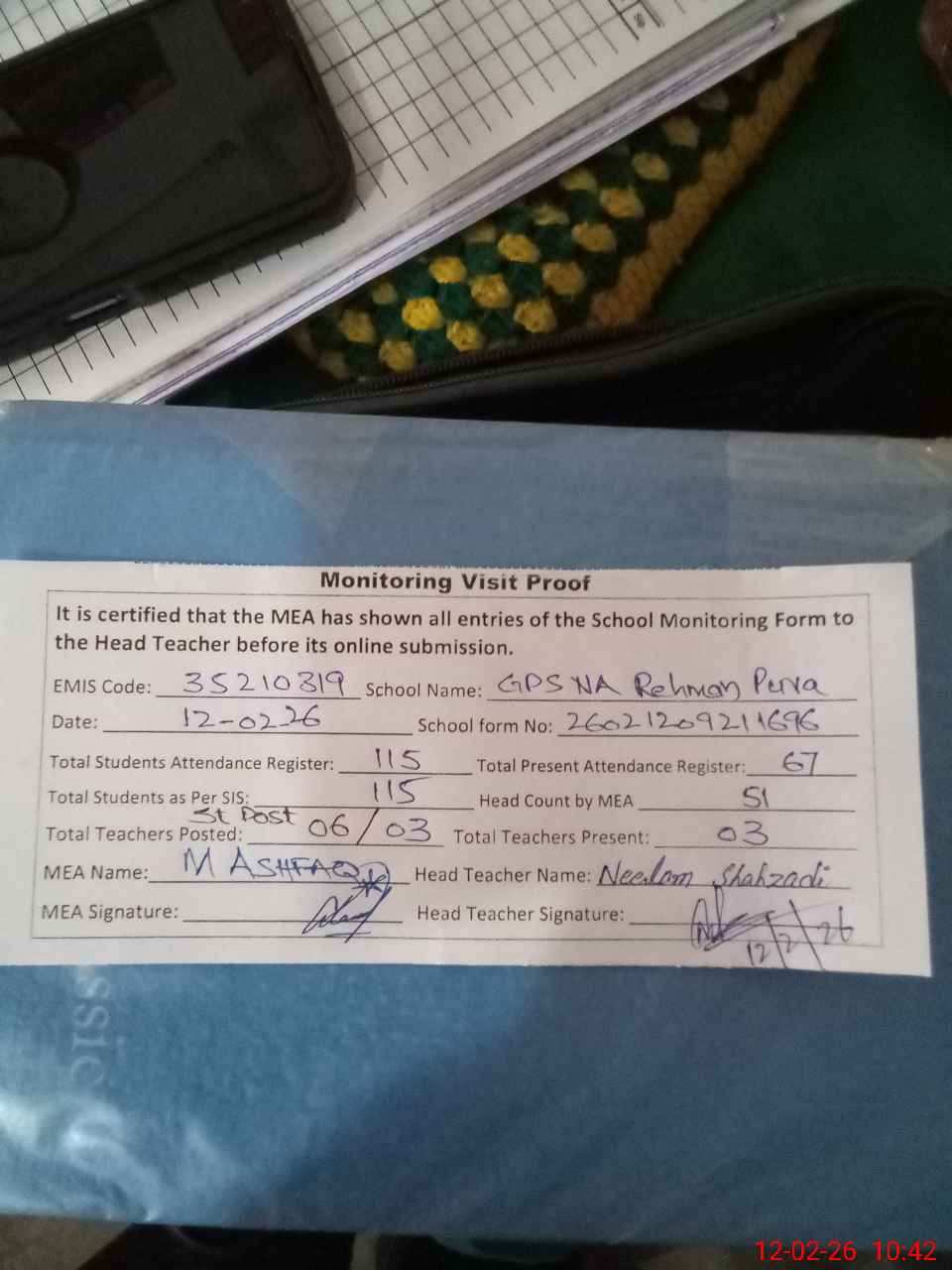 | Remarks (Use Separate Page if Required): DDEO Shahid Sardar visited on 10-02-26 Last visit by AEO Arshad Saeed Khan on 10-02-26 School has no it's own building. It is being conducted in the building of GHS Pakistan Model Rehman Pura. Here school has only three rooms given by above mentioned High school. Whole the school building looking average condition. Maintenance and paint work highly required. School ground looking muddy. 16 Students found less while head count. On Roznamcha 67 and head count 51 students present today 35210319 | |||||