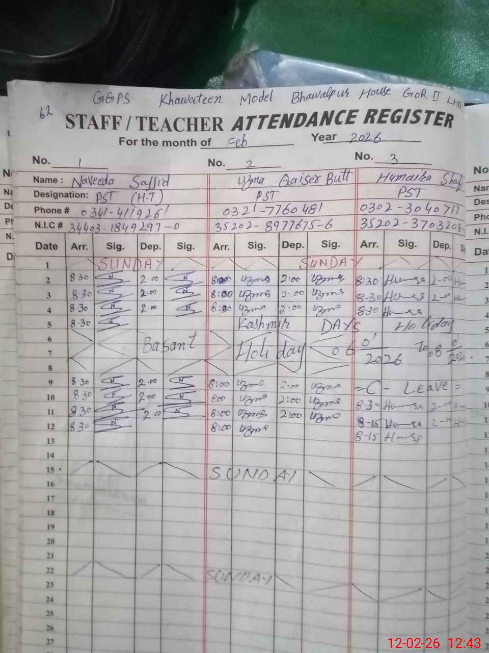 | Remarks (Use Separate Page if Required): Security Guard Muhammad Amir attached here and present today but his latest orders not available. DDEO Hina and AEO Sundas Fatima visited on 02-02-26 No Council Meeting conducted in the month of January 2026 School has total 13 rooms while 07 classrooms are looking very poor condition maintenance and renovation highly required 35210549 | |||||