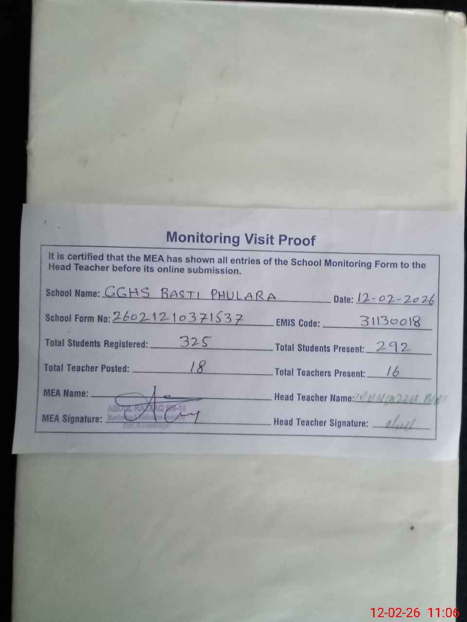 | EMIS Code: 31130018 | Name of School: GGHS BASTI PHULARA | |||