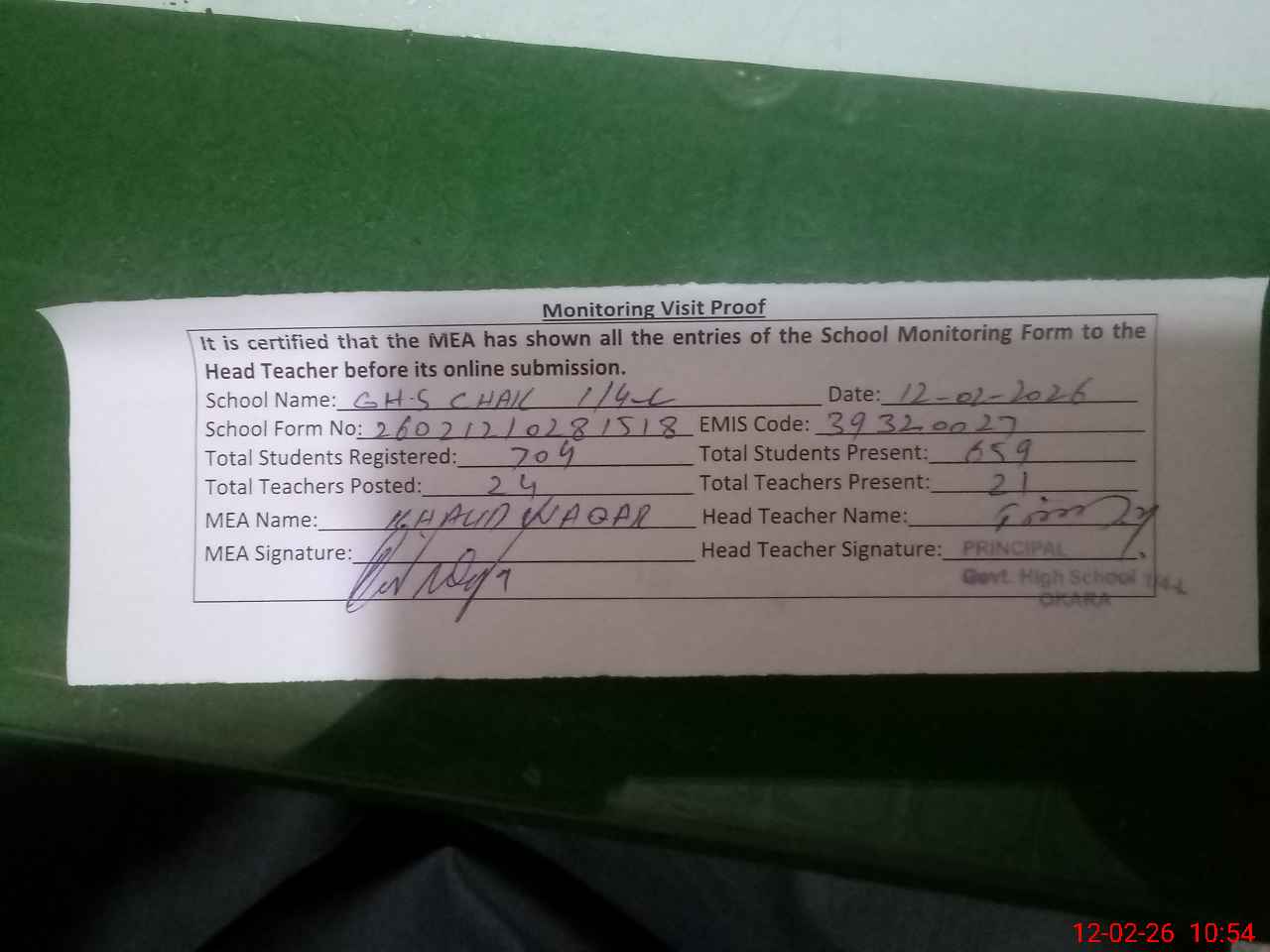 | Attendance Register | Head Teacher | MEA with School | Visit Proof |